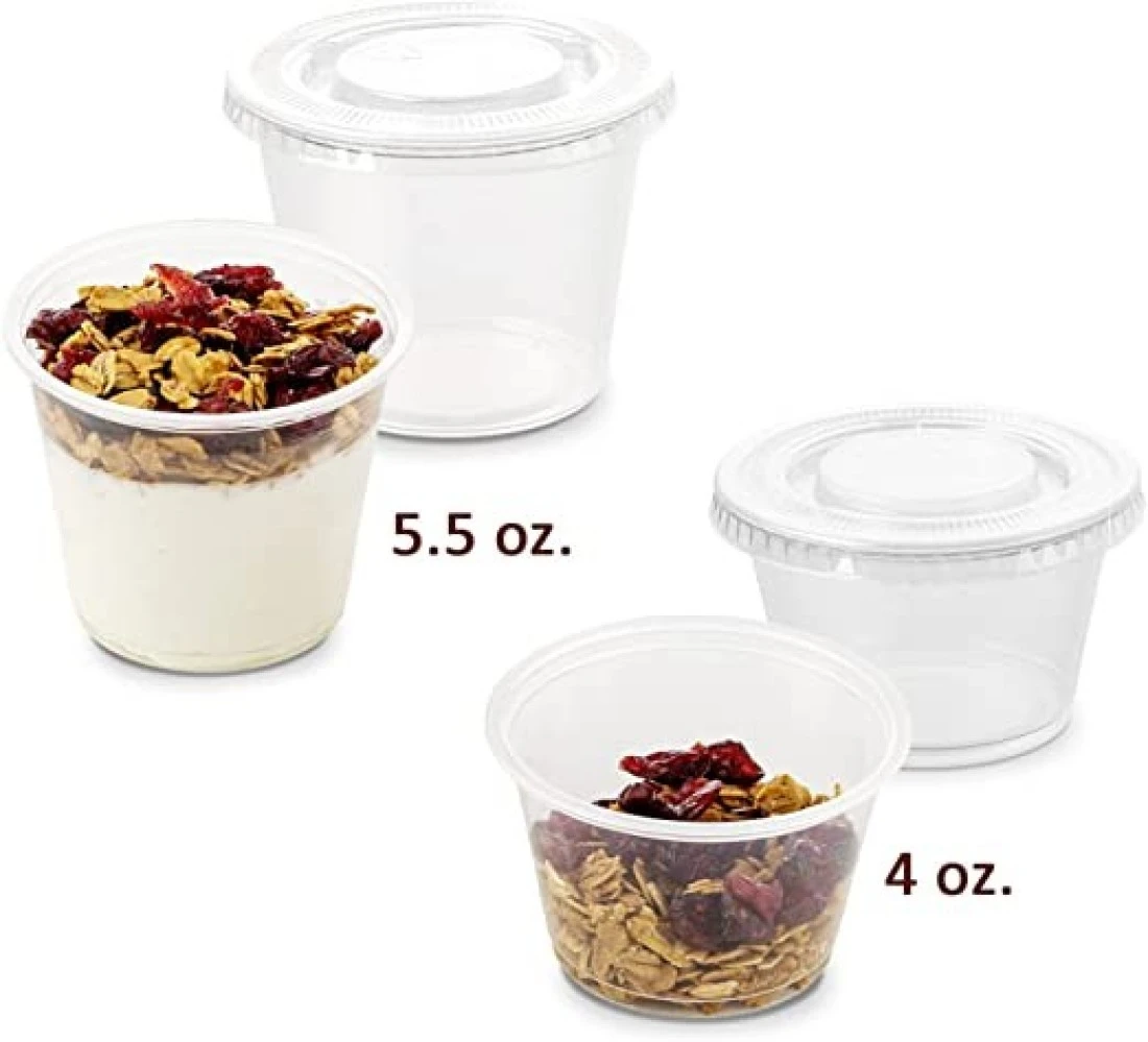 Yesocea [100 Pack] 5.5 Oz. Clear Plastic Disposable Portion Cups With Lids Sampling Cups, Portion Control Cups, Slime Container