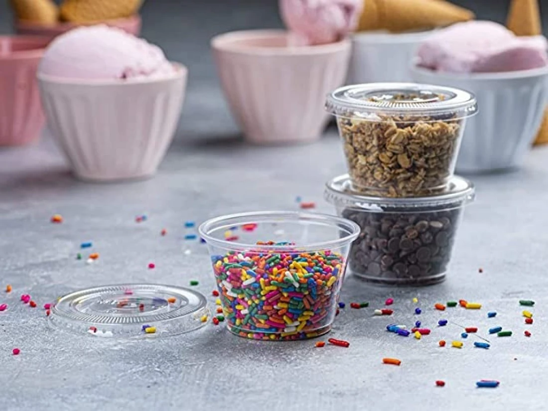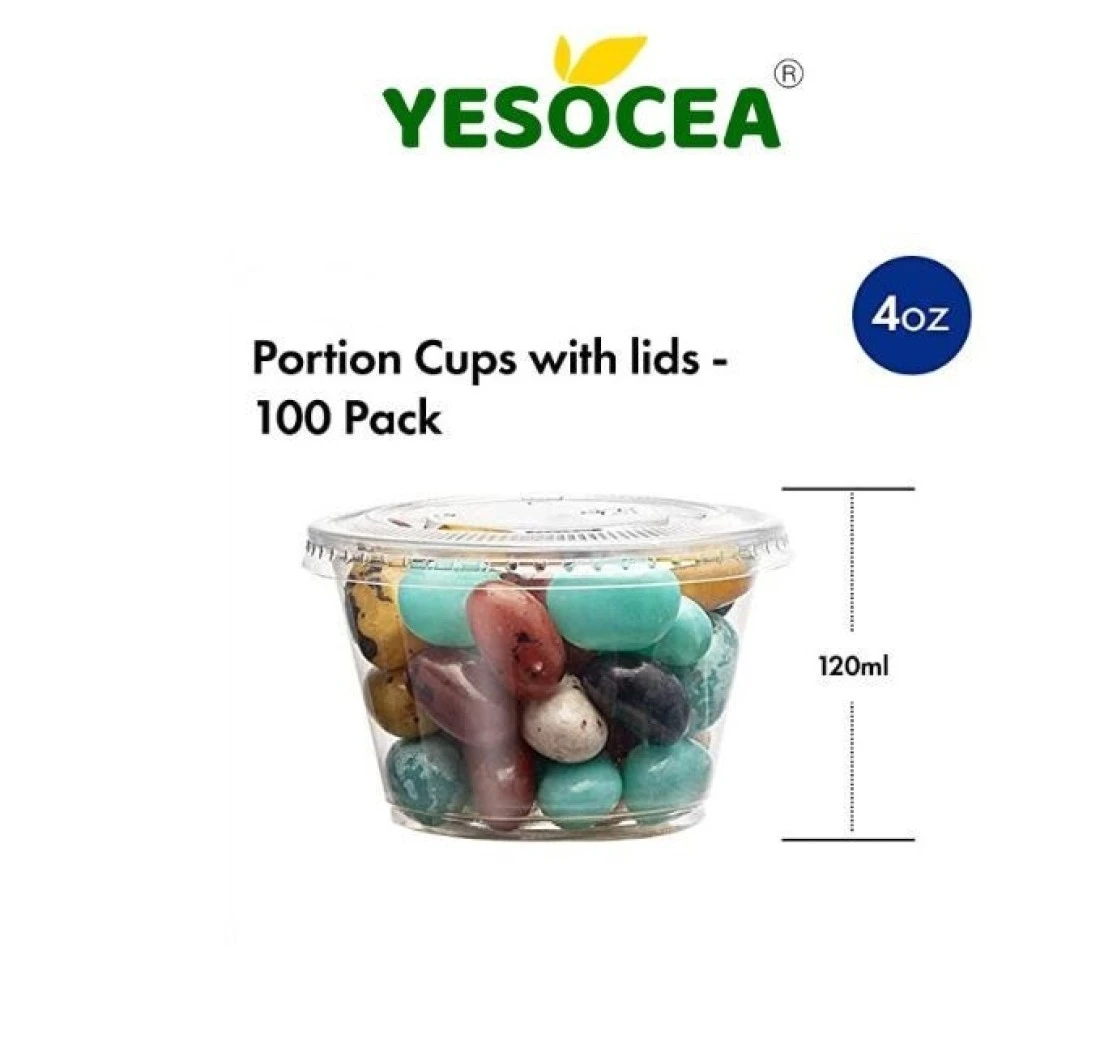 Yesocea [100 Pack] 4 Oz. Clear Plastic Disposable Portion Cups With Lids Sampling Cups, Portion Control Cups, Slime Container