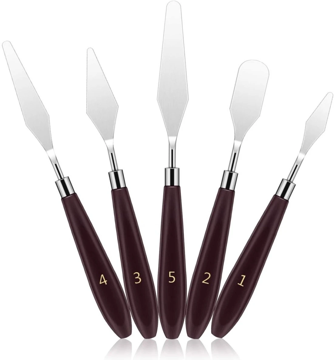 If you are fond of painting, or you have a painting job, or you are an expert of painting, these painting knifes are perfect for you because it can let you draw outstanding paintings and make you a better painter. There are 5pcs palette knife/painting spatula which is great for artists of any skill level. Specifications: --Material: Stainless Steel Blade, Wooden Handle --Handle Color: Wine Red --Wooden Handle Size: About 11cm --Blade Length: 3.8cm,4.9cm,6.2cm,7.5cm,9cm Applications: This set of painting palette knife can be used with many types of paint, acrylic painting, oil painting, ink painting, gouache painting, plein air painting, ceramics, pottery, arts & crafts, model / hobbyist painting, fabric painting, decoration, etc. Scrapers can be used to add colors and mix the paint, and you can also scrap the unsatisfied painting part and then re-color. This 5-piece stainless steel set offers assorted shapes and styles. Package Included: 5 x Palette Knife Set