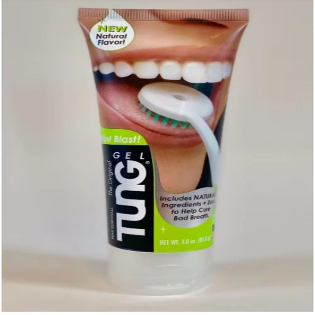 The Original TUNG Gel - Mint Blast Natural* contains Zinc, which naturally and safely eliminates bad breath by neutralizing the sulfur gas that comes from the tongue.. It will leave your mouth incredibly fresh and won't gunk up your toothbrush which is not designed for the tongue. *Formulation uses materials on the Natural Products Association list.
