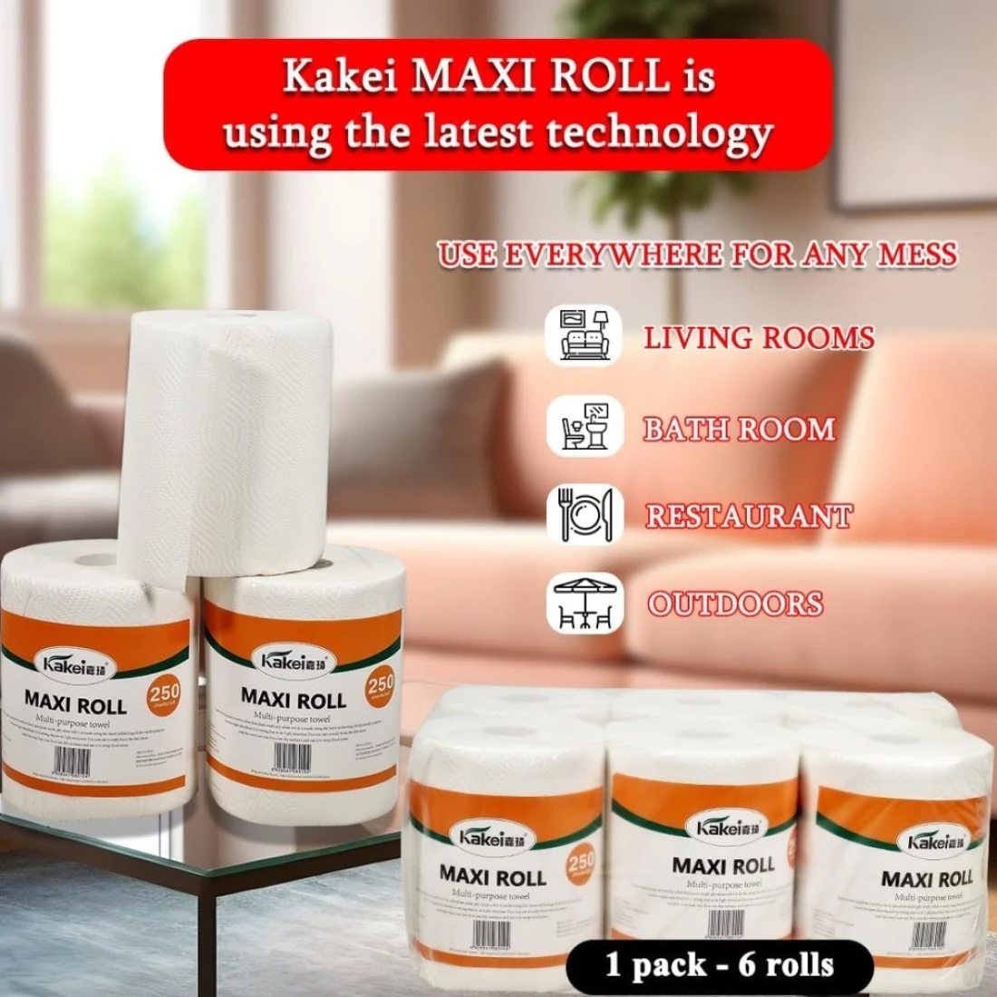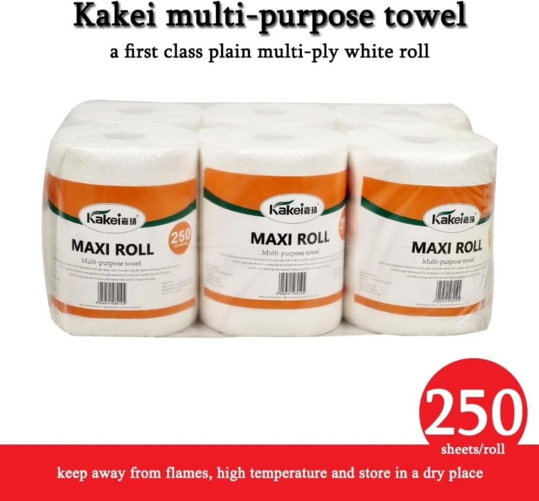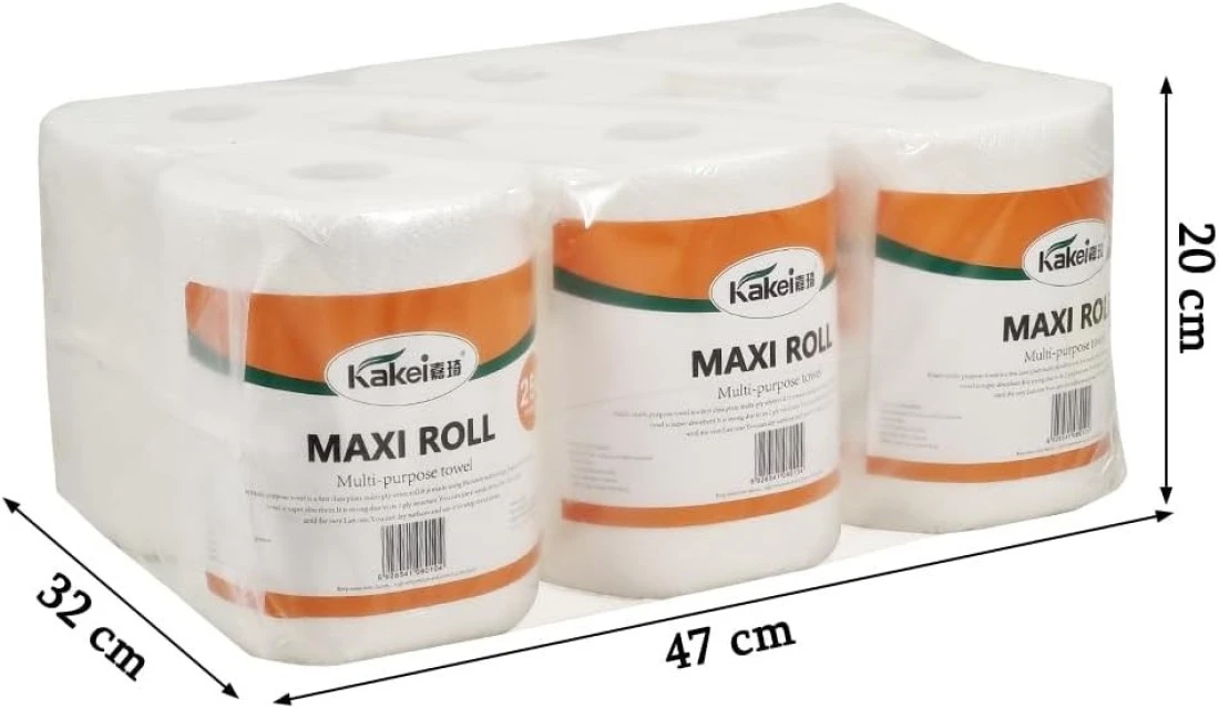 Multi-purpose towel with 2 ply, maxi roll, 250 sheets per roll, Absorbent, Soft and Strength, Suitable for dry surface, wrap food and any mess, 1 pack of 6 rolls, Wet & Dry Dual-use, 47 cm (White)