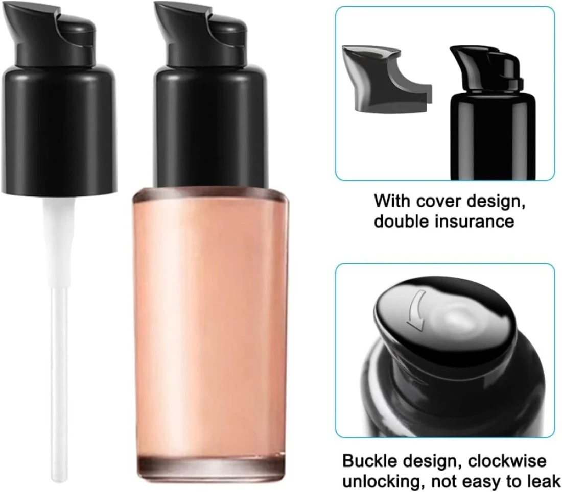 4 Pcs Replacement Foundation Pump for Bottle, Plastic Cosmetic Liquid Foundation Make-Up Pump Replacement Tool(with Spoon,Dropper,Funnel) Other tool sizes: Mini Clear Makeup Spatula Size: 3.23 in/ 8.2cm in total length Mini Clear Makeup Funnel Size: 1.46 x 1.46 in/ 3.7 x 3.7cm Mini Clear Makeup Dropper Size: 2.36 in/ 6 cm Detailed dimensional information Replacement Foundation Pump Size Length:3.82 inch/9.7cm. Diameter:0.94inch/2.4cm. Good Design & Clean and Hygienic Foundation pump designed with rotary switch and cap buckle, which could provide double protection for your foundation.No need to dip or pour, avoid messy clumps when pouring out foundation, no more contamination of your foundation. Swivel switch and cap closure design provide double protection for your foundation. Pressure control Original bottle mouth, easy to pour more leakage. More Applications Our plastic makeup liquid foundation pump replacement could compatible with some other different make-up foundations.You can tap on demand, reducing waste and saving time.(Note: The mention of brand names and any related model designation here is only for purposes of showing compatibility, not work as brands.) You can use these tools to dispense other cosmetics and can be applied to many places. Users Guide Before using, please clean the makeup tools with clean water and let them dry naturally.Take off the Cap of bottle,and screw the Replacement pump tightly to the bottle. Press the pump a few times before the foundation comes out for first time use. After that, just press the pump softly each time you can easily get the foundation as you need. What you will receive? You will receive 4 plastic makeup liquid foundation pumps, 1 makeup spatula, 1 mini makeup funnel and 1 makeup dropper.