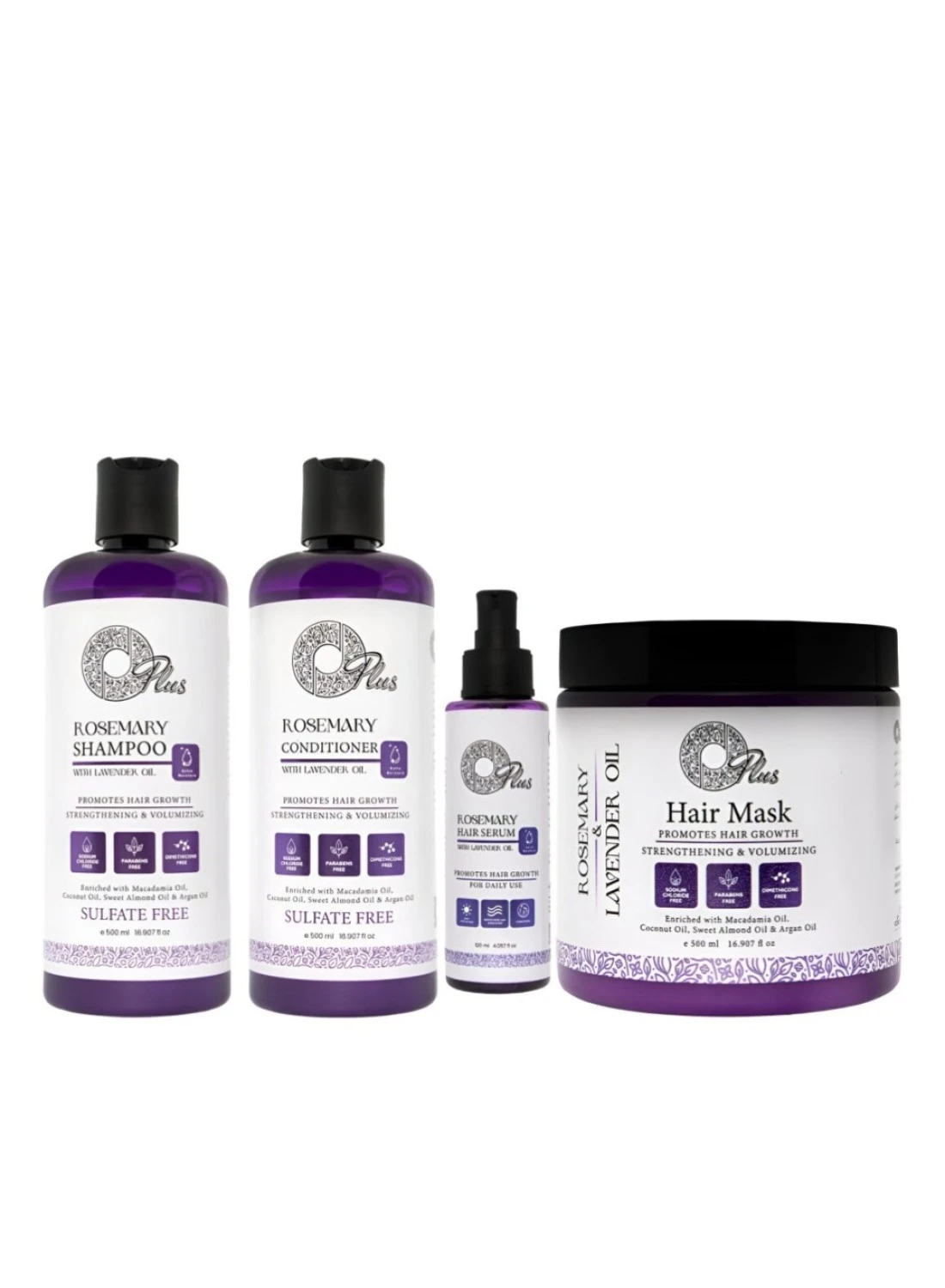 Complete Hair Care Set: Includes Lavender Oil Conditioner (500ml), Rosemary Shampoo with Lavender Oil (500ml), Rosemary Hair Serum (120ml), and Hair Mask (500ml). Promotes Hair Growth: Formulated with rosemary and lavender oils to encourage hair growth while strengthening hair strands. Natural Oils Enriched: Infused with macadamia oil, coconut oil, sweet almond oil, and argan oil for intense nourishment and hydration.Adds Volume & Strength: Helps thicken hair and restore strength for healthier-looking locks.