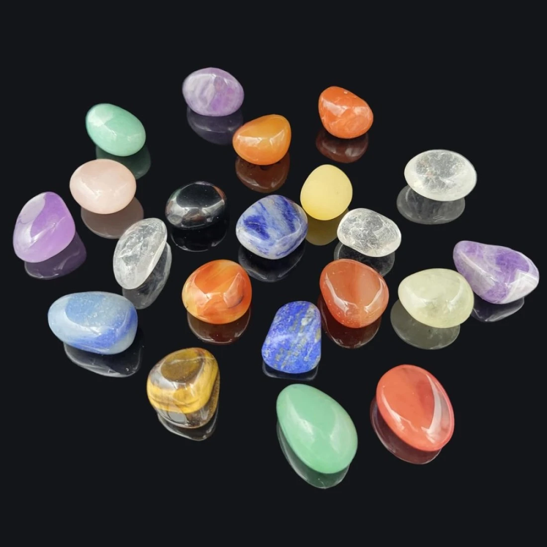 3set healing stones and crystals:package include 3pcs amethyst,3pcs clear quartz,3pcs carnelian,1pcs lapis lazuli,1pcs blue aventurine,1pcs sodalite,1pcs calcite,1pcs citrine,1pcs tiger's eye,1pcs cherry quartz 1pcs black obsidian,1pcs red jasper,2pcs green aventurine,1pcs rose quartz,totally 21pcs charka stones., Energy crystals attributes:as all we know ,each chakra balancing stones has different attributes,such as Amethyst helps relieve stress and anxiety,Lapis Lazuli is a protective stone that contacts spirit guardians.Citrine is one of the stones of abundance. This dynamic stone teaches how to manifest and attracts wealth and prosperity., Dimension of Tumbled Stones:These plam stones are measured about 0.4-0.8inches/15-20mm,travel collections size to carry around.these gemstones also fits for sending as birthay gift,Christmas gift,wedding gifts and so on., Widely Applications:these crystal stons are super for chakra balancing,healing, tumbling, meditation, sound sleep, rock collections ,mineral specimen ,crystals study, jewelry making, vase filler,wish bottles filler, feng shui stones. fountains rocks, art and craft projects, pocket stones,crystals for candle making and other home decorations works., Other Benefits:Natural quartz crystal rock chips energy crystals mineral specimens is a good choice for children to learning,expand their sight and close to nature,improve geography knowledge.