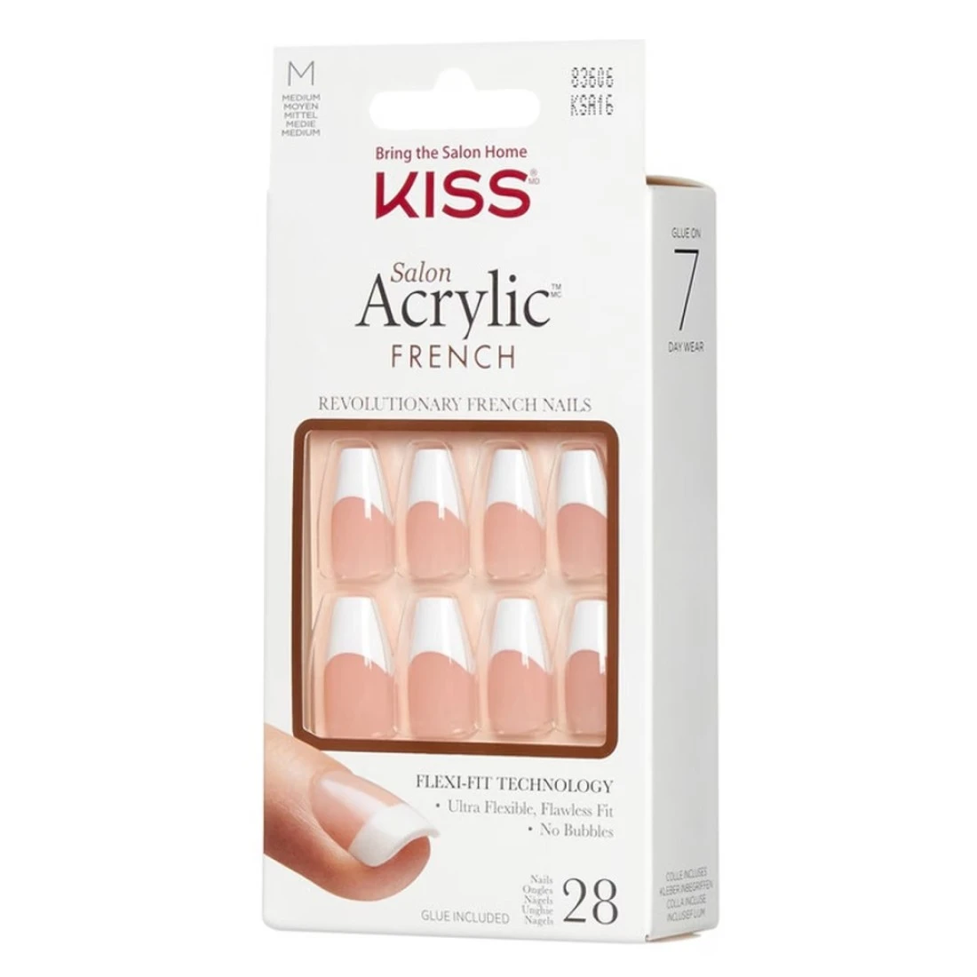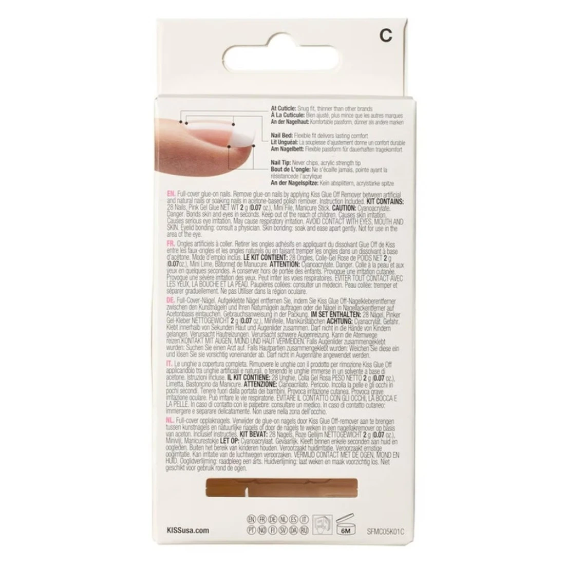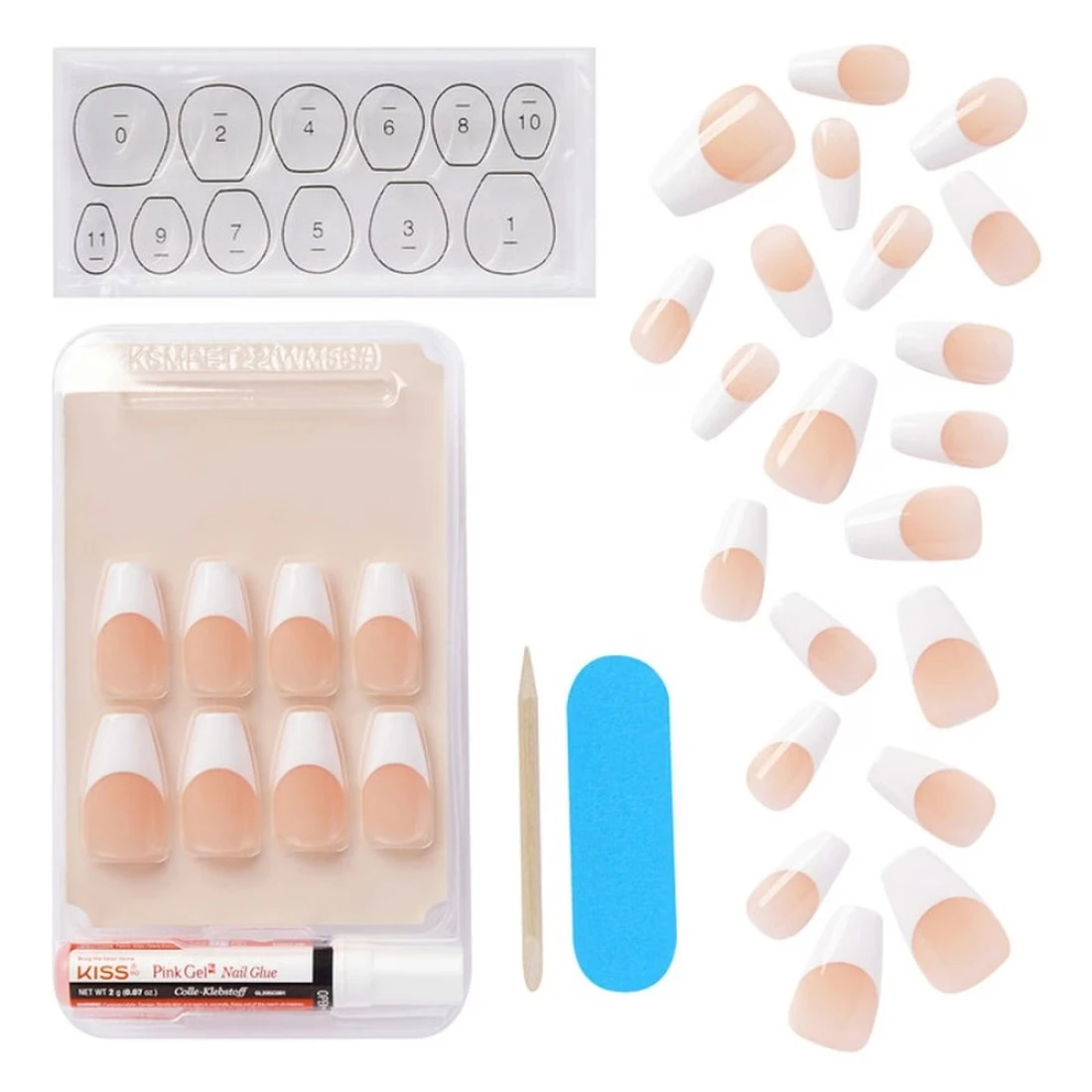 - Benefits: 28 nails in 14 sizes Short length, thin smile line 2 g glue, mini file, manicure stick included FlexiFit technology for ultra comfort Up to 7-day wear