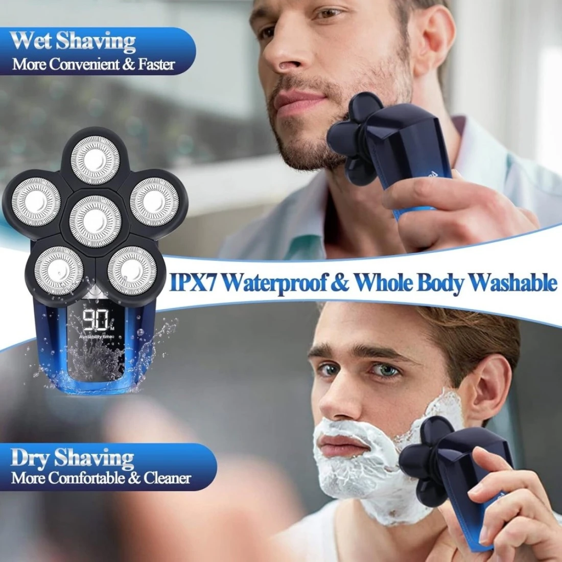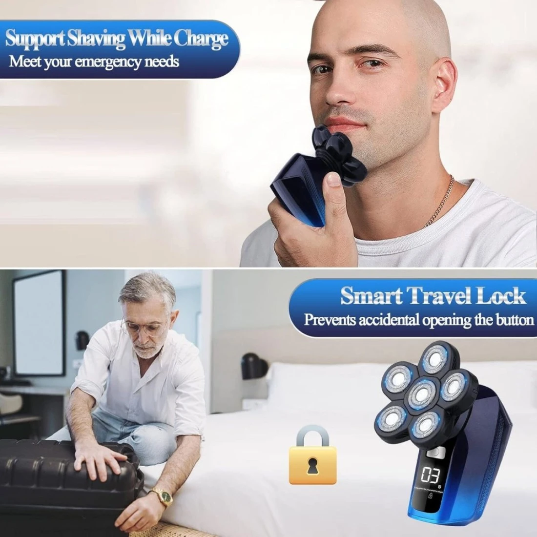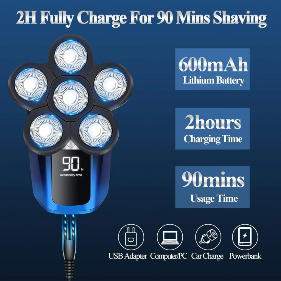 5-in-1 Grooming Kit Includes multiple attachments for shaving, trimming, and grooming your bald head, face, and beard. 🔪 Advanced 5D Rotary Blades For a close, smooth shave that contours to your head and face with precision and comfort, perfect for sensitive skin.