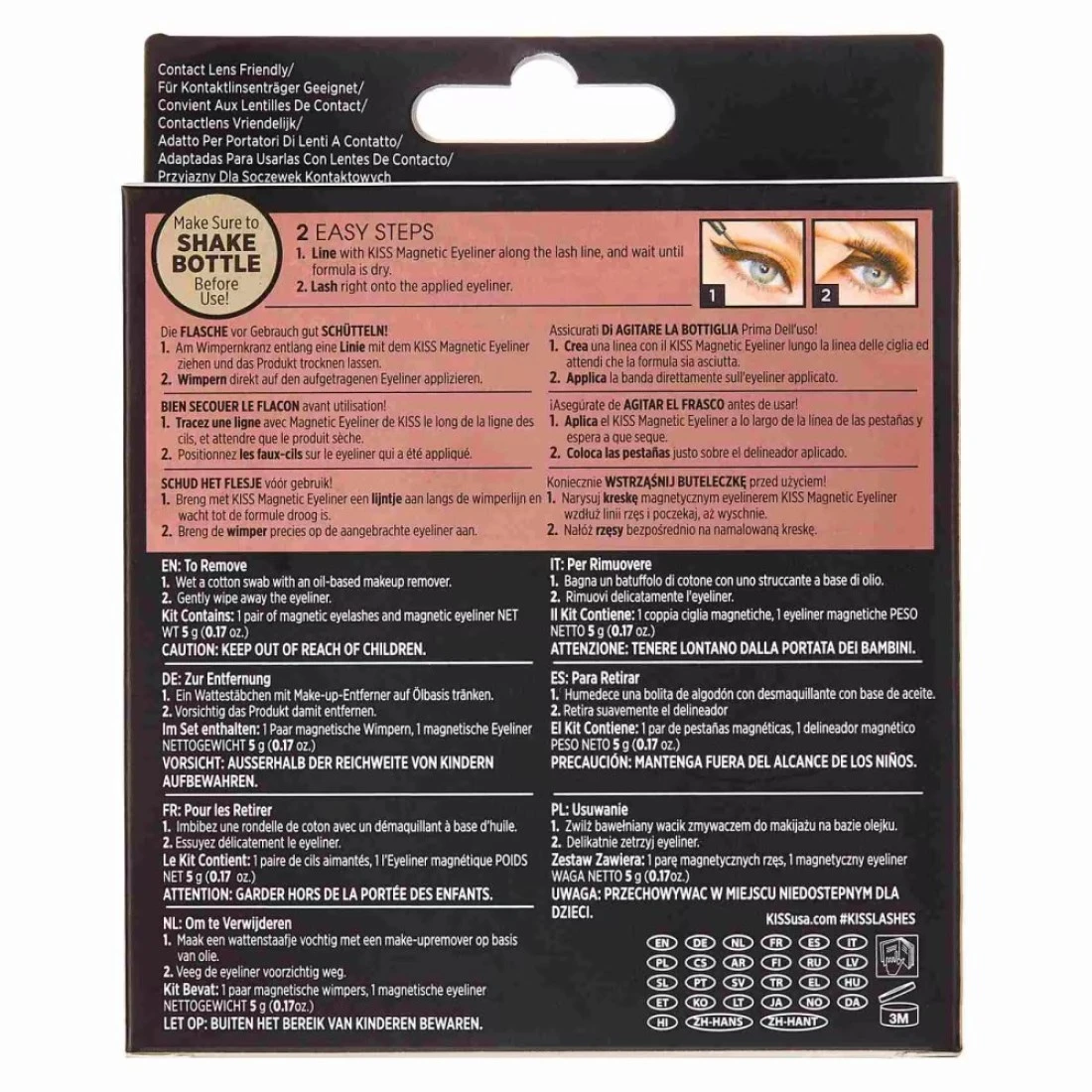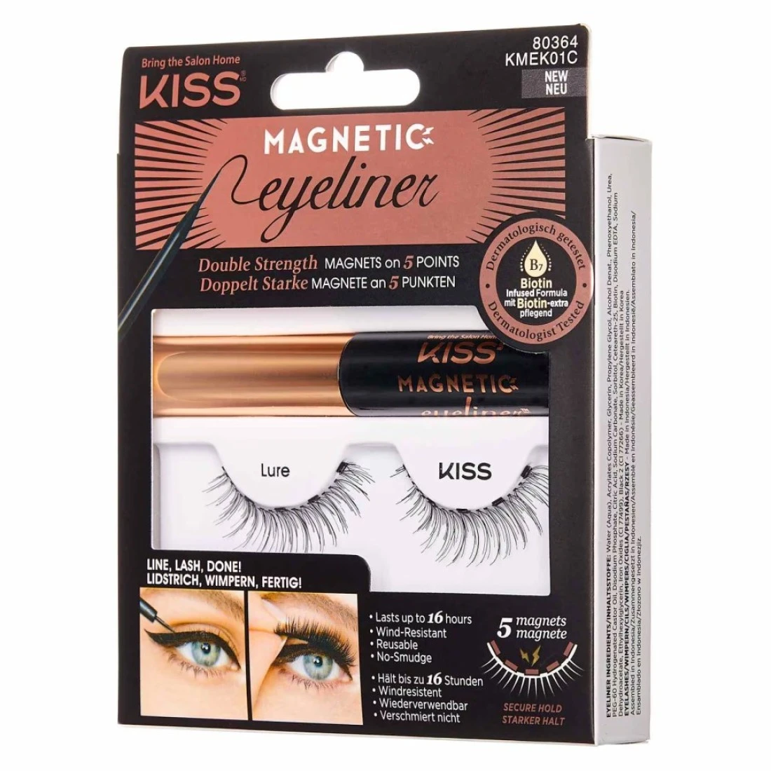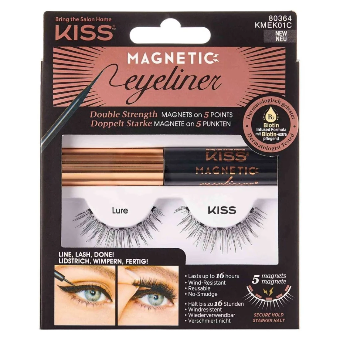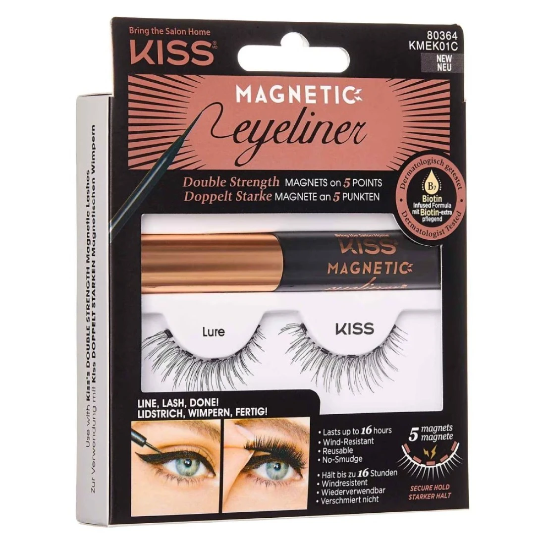 - Kiss magnetic eyeliner and lash kit, lure, 1 pair of synthetic false eyelashes with 5 double strength magnets and smudge-proof, biotin infused black magnetic eyeliner with precision tip brush