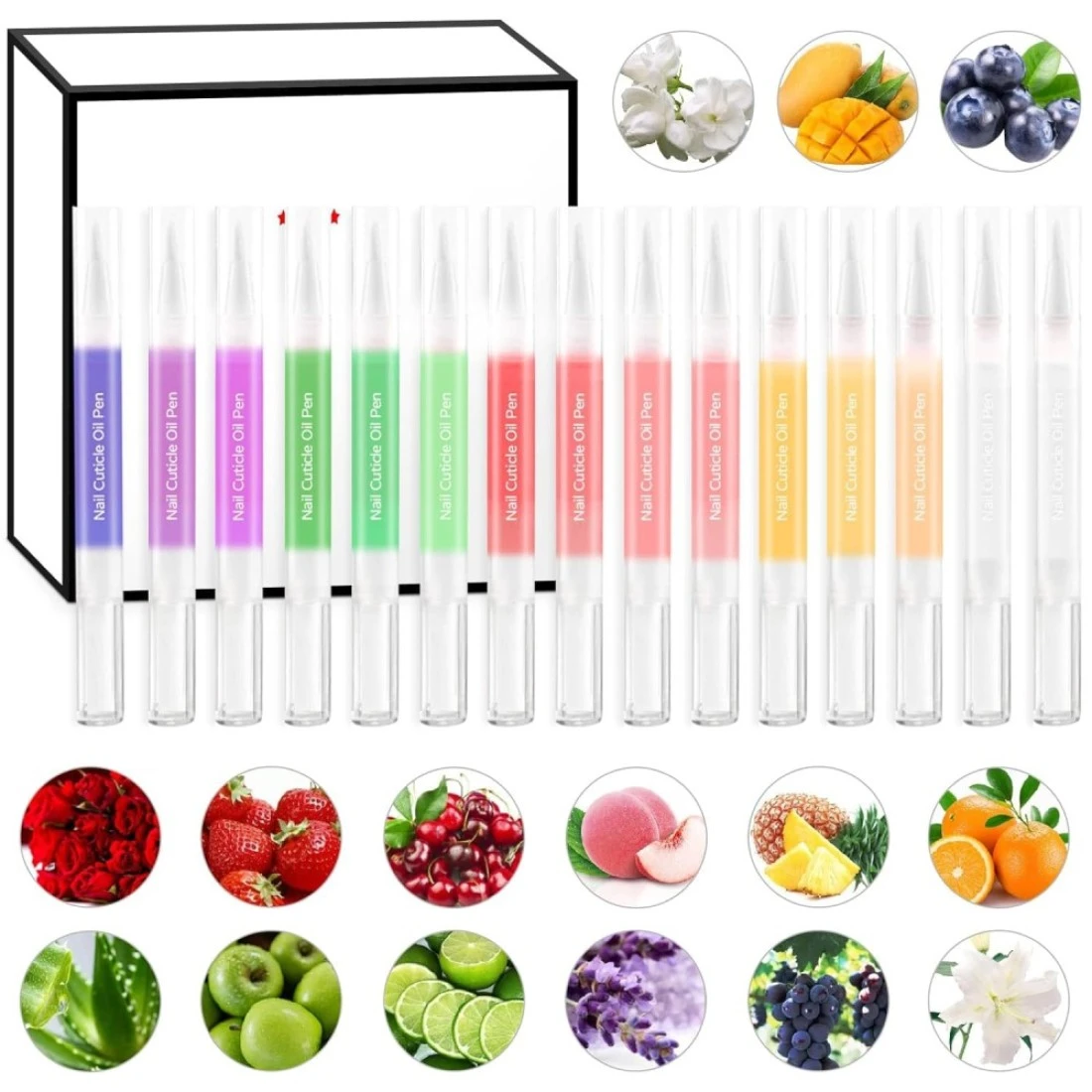 đăHigh quality nail cuticle oil penă:Our nail repair cuticle oil pens are made from pure natural oil ingredients, it is also a high-quality nail nutrient oil. Natural ingredients extracted from plants can improve the health of skin and nails., đăPerfect function of nail cuticle oil penă:The cuticle oil can softens and inhibits dead skin growth, protects your hands from barbs, reduce epidermal wrinkles, and promote healthy nail growth. Cuticle oil repair pen makes your hands smooth, delicate and shiny., đăCuticle oil pen setă:This cuticle oil pens bulk is perfect for nail care, it is helpful for nail nourishment and keeping nails healthy. This nail cuticle oil pen set included 15 kinds of taste: Jasmine, pineapple, lavender, green apple, cherry, lemon, blueberryďźorange, rose, strawberry, grape, aloe, lily, peach, mango., đăPen shape appearance designă:Our nail cuticle oil pen is a pen with a brush.The cuticle oil for nails is convenient to carry and use, and can apply the oil to the root of the nail accurately and efficiently without wasting., đăThe high-quality service of the nail cuticle oil penă:If you have any questions about the nail cuticle oil pen, please contact us in time, and we will give you a satisfactory answer.