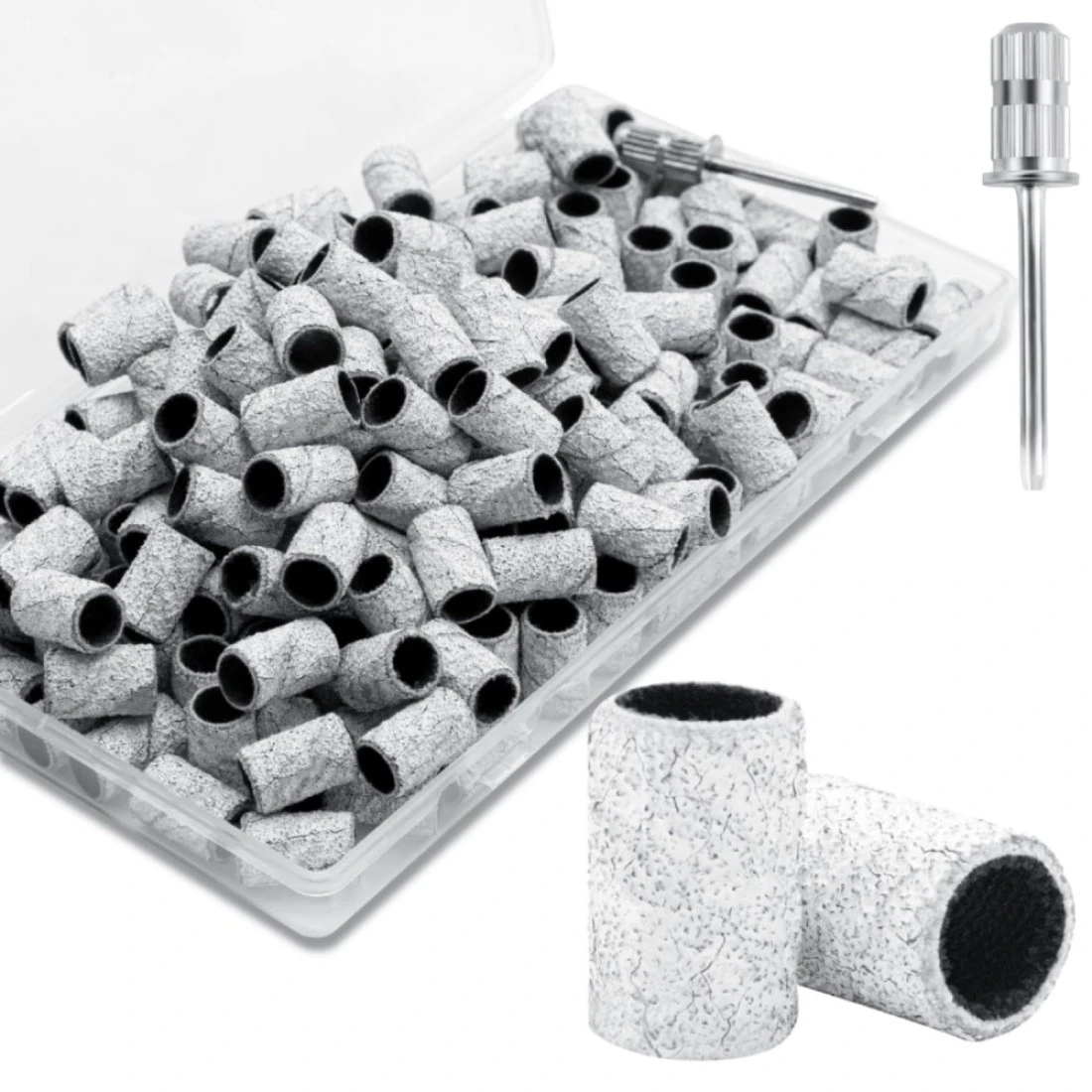 NAIL SANDING BAND - You will get 100pcs 150grit nail sanding bands and one sanding bit for nail drill. 3/32” Mandrel bits for electric nail drill are suitable for most nail drill. The sanding bands & mandrel bit is for any nail technician or beginners., MULTI-USAGE NAIL DRILL SANDING BAND - 150grit medium grit sanding bands, suitable for shortening and shaping natural fingernails. These sanding bands great for removing gel polish., RELIABLE SANDING BAND NAIL - Our sanding band using high quality glue to make the sanding paper’s gap glued completely, not easily unraveled. It’s thickened and hardened, tightly grip the nail drill bit, ensure the sand band will not easily fly out., SUPERIOR E-FILE SANDING BANDS - Our nail sand band, using premium sandpaper, won't come off easily. The nail drill head bit is made of high-quality stainless steel material, easy insertion of the bit, and stable use during high-speed rotation., SANDING NAIL BAND GREAT SERVICE - If you have any problem with our products, we offer no reason to return or exchange service, please feel free to contact us. We will keep 24 hours online to answer you until that you are satisfied.