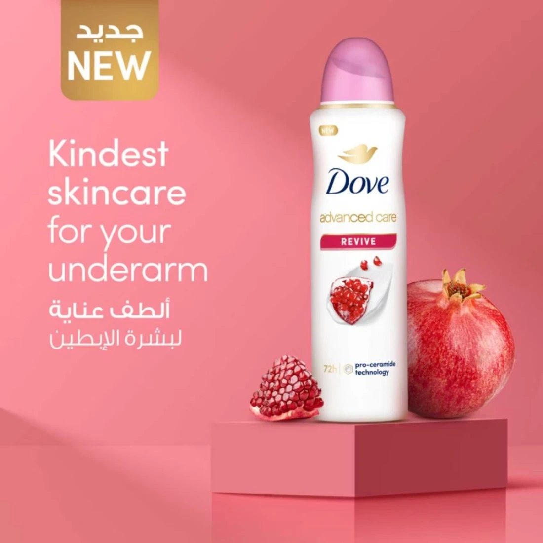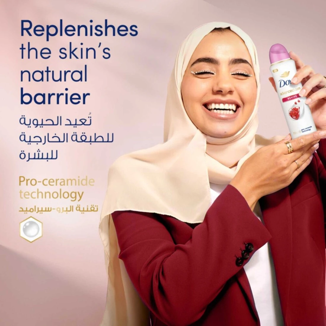 Shaving or waxing can leave the skin on your underarms feeling damaged and dehydrated, making it vulnerable to irritation, redness and sensitivity. Dove NEW Advanced Care Antiperspirant Deodorant for women Revive Scent not only helps keep your underarms fresh and sweat-free, but it is also the kindest anti-perspirant in the market that helps restore skin barrier after shaving. Formulated with Pro-Ceramide technology, this NEW and unique formula consists of skin-loving ceramides that provide advanced underarm skin care by strengthening skin’s barrier to help boost ceramide levels, leaving your underarms feeling soft and smooth with all-day protection without irritation. From hurried mornings to busy afternoons and relaxed evenings, Dove Deodorant Spray with Revive scent is designed to be with you and keep you fresh every step of the way. Bursting with a vibrant, juicy fragrance of pomegranate, it helps bring a sense of vitality and renewal while providing freshness and immediate odor control. With long-lasting 72 hours of powerful antiperspirant protection, it helps neutralize body odor and control sweat, so you can feel calm, cool and confident as you go by your daily activities. Crafted to provide all-day confidence with protection and comfortable skin, this women's deodorant spray perfume offers effective odor control without the use of alcohol, reducing any chance of skin irritation. Experience fresh and soothing underarms with Dove Revive Antiperspirant Deodorant Spray that delivers lasting sweat and odor defense + repaired and moisturized skin. How to use: Shake the deo aerosol spray can well, then hold it 15cm away from your skin. Spray the deo under each of your underarms for 2 seconds, ensuring you cover the entire underarm area. Don’t let body odor, wetness and underarm irritation get in the way of your goals. Choose Dove Advanced Care Revive Spray for superior underarm care after shaving and stay fresh, sweat-free and comfortable all day long. No one repairs your skin barrier better after shaving than our Advanced Care Spray Deodorant.