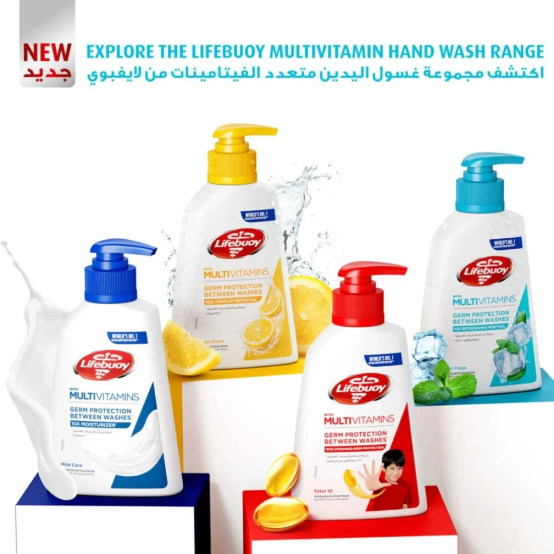Lifebuoy Hand Wash gives 100% stronger germ protection in just 10 seconds, forming a powerful germ shield that lasts for up to 10 hours between washes. Lifebuoy Cool Fresh handwash is infused with 10x refreshing menthol' for 12 hours of lasting freshness. This innovative formula ensures your hands are consistently protected, providing a deep clean that extends beyond the wash. The new advanced multivitamin formula in Lifebuoy’s liquid soap hand wash creates an active barrier on your skin, offering protection against germs throughout the day. As the world’s number one choice for germ protection, Lifebuoy is trusted by families across the globe for its proven effectiveness. Dermatologist-approved and thoroughly tested, this antibacterial hand wash is designed to be safe for all skin types. It not only cleanses thoroughly but also maintains the skin’s natural barrier, ensuring that your hands remain both clean and cared for. Discover the full Lifebuoy range and choose from Lifebuoy Total 10, Mild Care, Lemon Fresh, or Cool Fresh collections. Each variant offers the same high level of protection and refreshing experience, making it easy to find the perfect hand wash for your needs. Handwashing at five key moments in the day (washing hands after going to the toilet, before breakfast, lunch and dinner, and while having a bath) with Lifebuoy Cool Fresh antibacterial handwash will keep your kids protected for germs and diseases as well as make their hands smell great! *As per lab test on indicator organism vs ordinary soap without actives 'vs previous formula
