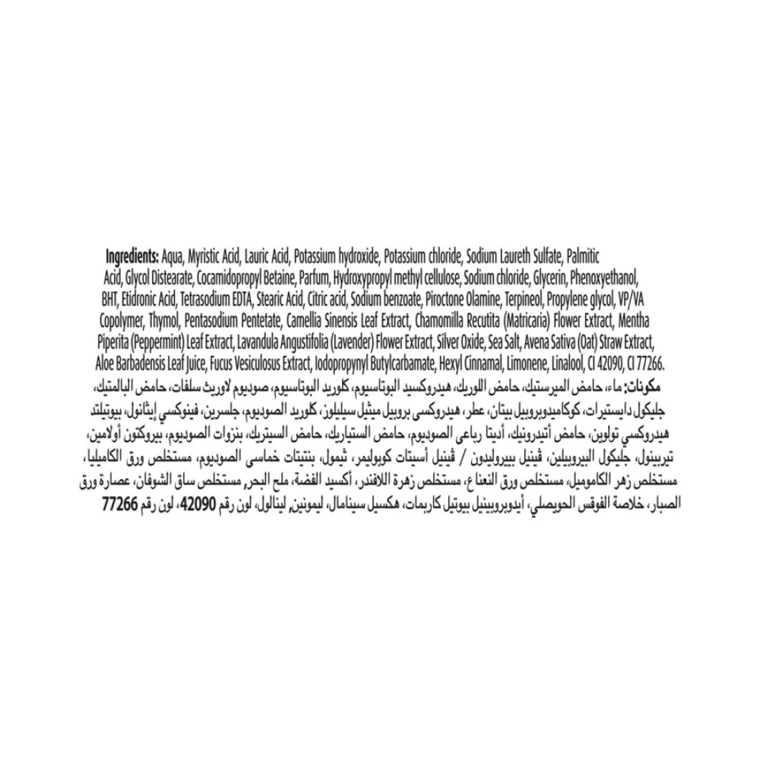 ingredients : Aqua, Sodium Laureth Sulphate, Glycol Distearate, Sodium Chloride, Cocamide Mea, Parfum, Terpineol, Thymol, Silver Oxide, Citric Acid, Acrylates Copolymer, Sodium Benzoate, Ppg-9, Sodium Hydroxide, Tetrasodium Edta, Vp / Va Copolymer, Glycerine, Pentasodium Pentetate, Avena Sativa (Oat) Straw Extract, Camellia Sinensis Leaf Extract, Chamomilla Recutita (Matricaria) Flower Extract, Lavandula Angustifolia (Lavender) Flower Extract, Mentha Piperita (Peppermint) Leaf Extract, Sea Salt, Aloe Barbadensis Leaf Juice Powder, Fucus Vesiculosus Extract, Butylene Glycol, Sodium Sulphate, Hexyl Cinnamal, Limonene, Linalool, Ci 42090, Ci 77266