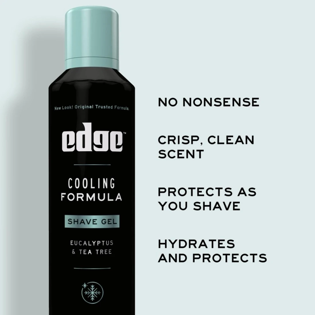 NO NONSENSE - Edge Shave Gel for Men is perfect for guys looking to protect their skin and leave it feeling smooth, refreshed, and free of irritationCOOL AND REFRESHING - Infused with the distinct scents of Eucalyptus & Tea Tree, this mens shaving gel has cooling conditioners that leave skin feeling fresh and invigoratedPROTECTS AS YOU SHAVE - Formulated to protect your skin from irritationSMOOTH AND HYDRATING - Unique blend of moisturizers and lubricants provides exceptional razor glideSHAVING REGIMEN - For ultimate skin protection, substitute your favorite mens shaving cream with the Edge Shaving Gel for Men and combine with the Schick Hydro 5 Razor