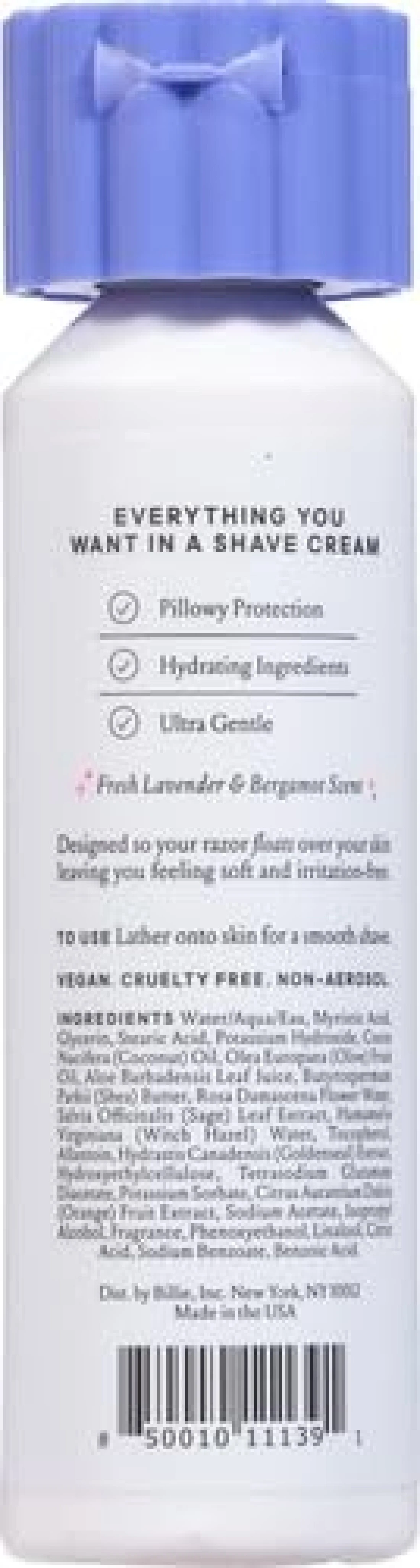 ULTRA NOURISHING PROTECTION: Made with skincare ingredients like coconut oil to help lock in moisture for soothed, velvety soft skin. Plus shea butter and aloe help create a soothing, protective barrier while you shave. It has everything you’d want in a gentle shave product.FLUFFY WHIPPED TEXTURE: With a dense-yet-whipped formula that’s 100% aerosol-free, this shave cream creates a fluffy barrier between your skin and your razor, beginning as thick cream then magically puffing up into a comfy airy layer.LAVENDER & BERGAMOT SCENT: Smells like sweet floral with a light citrus touch. There’s nothing better than a dazzling aroma while you shave!DERMATOLOGIST-APPROVED: Safe for all skin types, even sensitive skin. Say bye to irritation and hello to smooooooth skin.NON-AEROSOL, SULFATE-FREE, PARABEN-FREE, VEGAN, CRUELTY-FREECOMPLETE YOUR SET: Pairs perfectly with the award-winning Billie razor for the ultimate shave experience. Find one in your favorite color to help brighten up your bathroom!