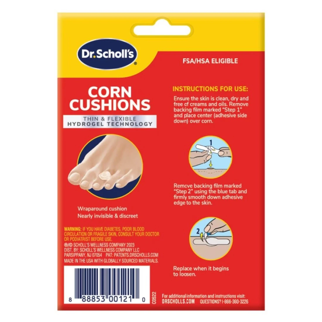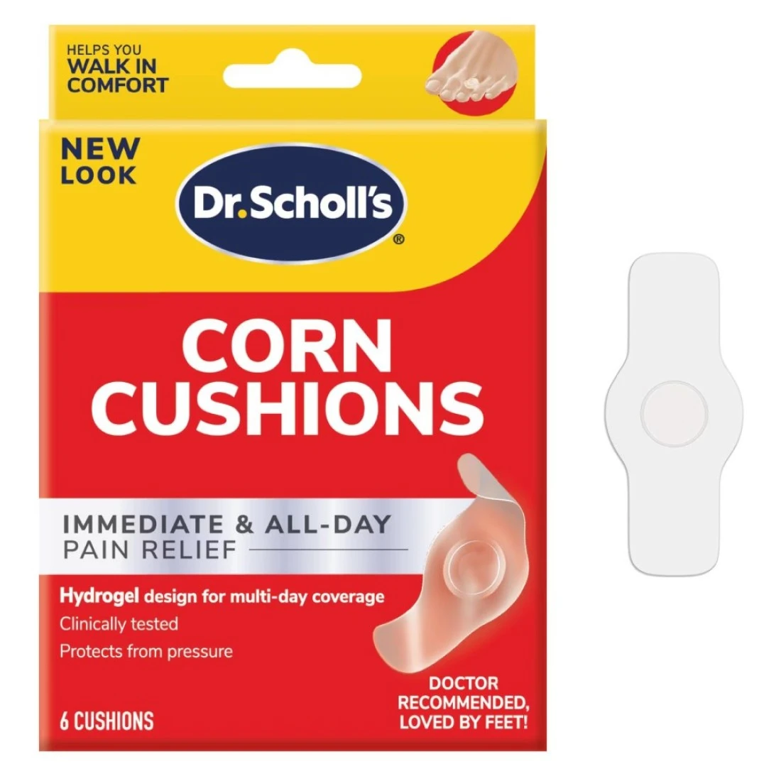 Dr. Scholl's Gel Corn Cushions are a pack of 6 cushions designed to provide relief and protection for corns. The cushions are made with a soft gel material that helps to reduce pressure and friction on the affected area, providing immediate comfort. They are easy to apply and can be worn with shoes, allowing for all-day relief. These cushions are a convenient and effective solution for those suffering from corns.