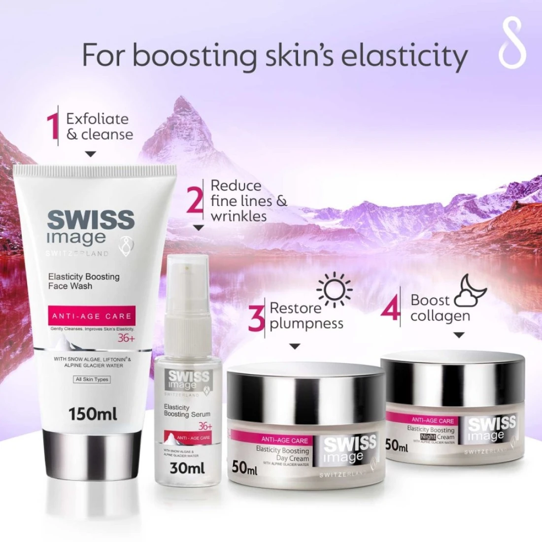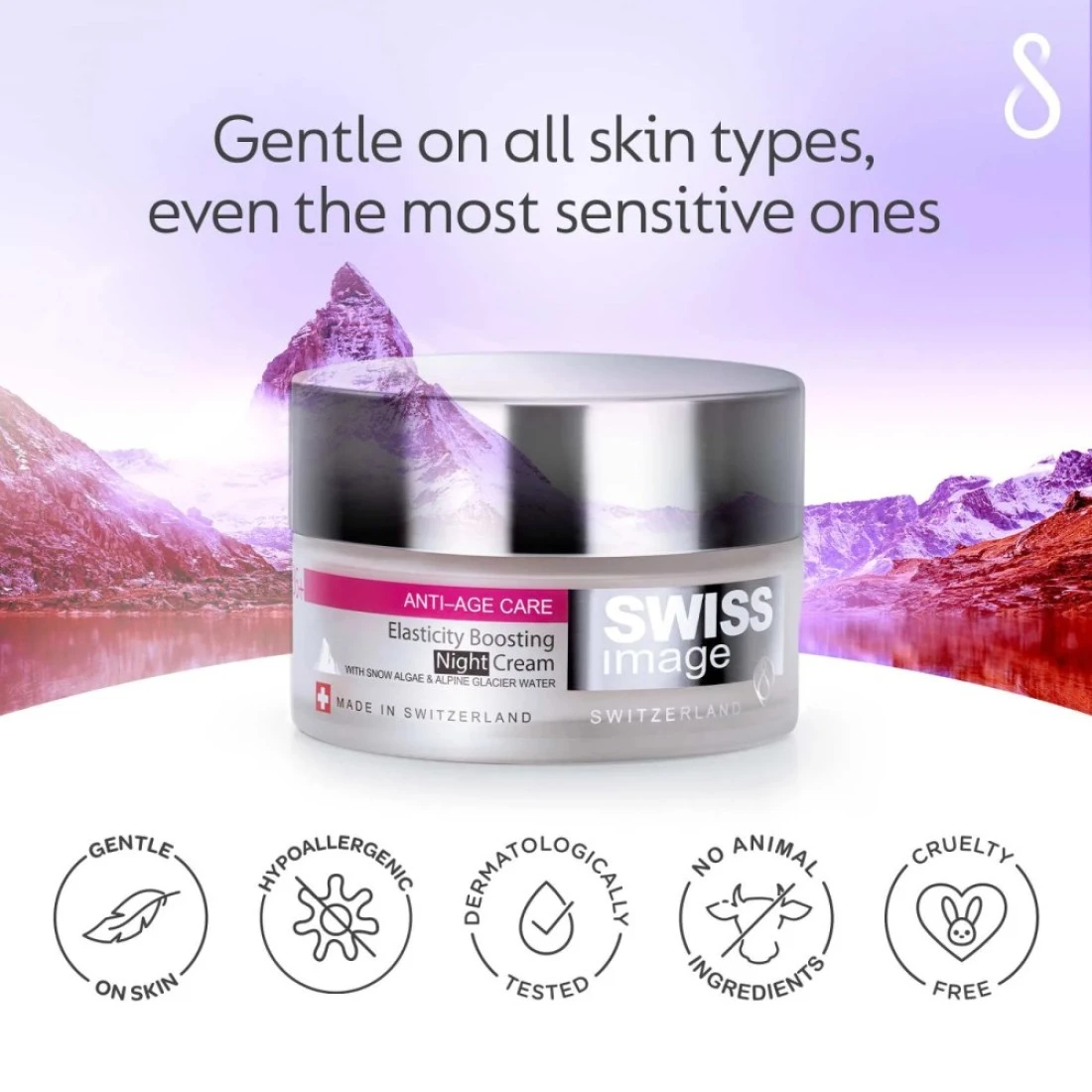 Elasticity Boosting Night Cream is formulated with a new anti-ageing technology this overnight cream supports the natural regeneration cycle of the skin and protects the skin from signs of ageing. Enriched with Alpine Glacier Water the cream's botanical complex promotes collagen production boosts elasticity and reduces the appearance of wrinkles & fine lines. Swiss Alps Snow Algae is known for its ability to survive in extreme conditions strengthen the skin barrier mechanism and reduce the effects of ageing on skin proteins.