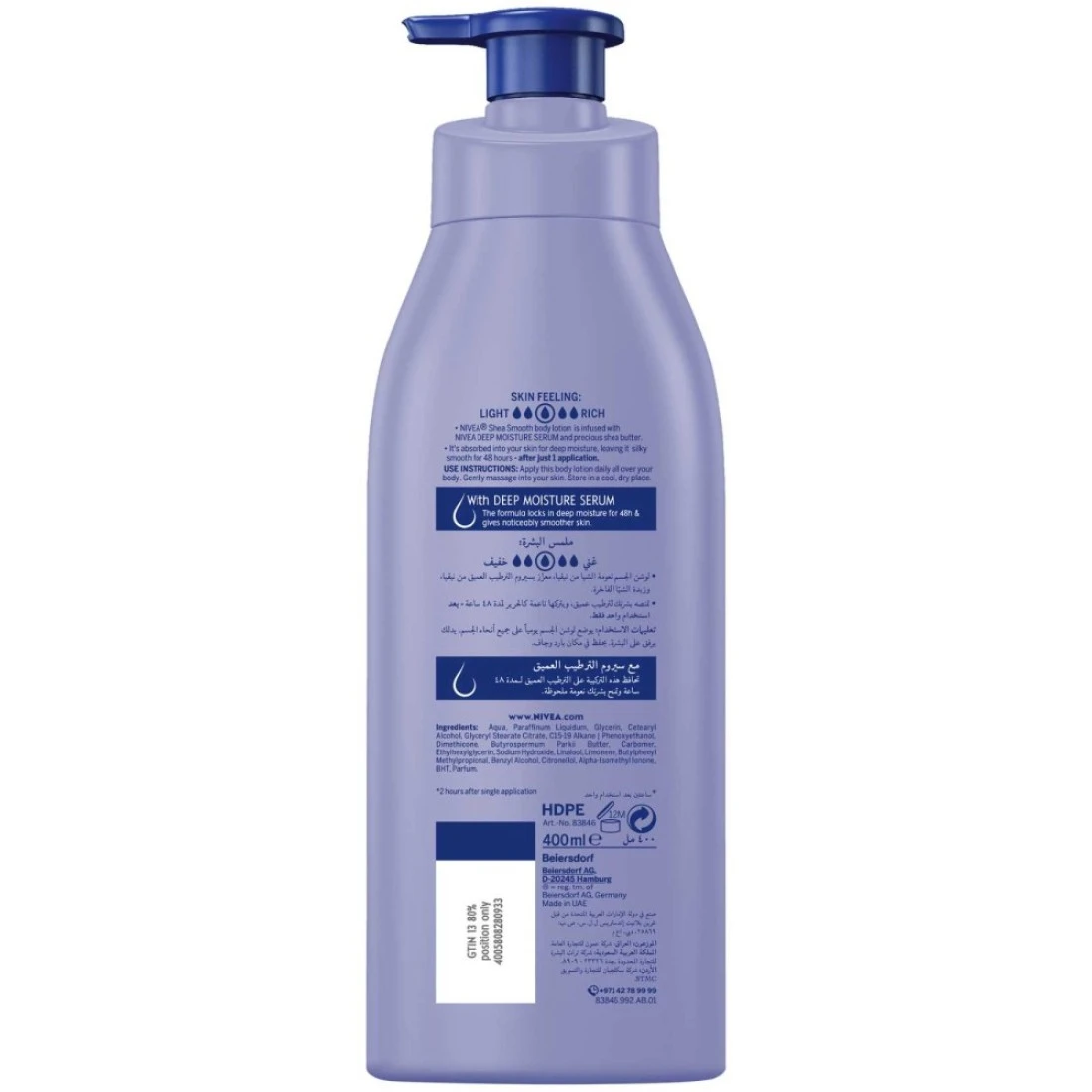 NIVEA Smooth Sensation Body Lotion is a special smoothing formula that provides 48hours indulging moisture care for noticeably smoother skin, just after one application.Enriched with deep moisture serum and nourishing shea butter, NIVEA Smooth Sensation Body Lotion delicately melts into your skin, making it soft, supple and comfortable.At NIVEA we’ve got a vast selection of soaps, shower gels, bath additives, deodorants, creams, lotions, milks and a lot more. If you’re looking for products to help improve the healthy look or glow of your skin, we’ve got you covered! Take a look now and discover the ideal NIVEA product for your needs and preferences. We have products for both men and women including shaving items and deodorants for all of your personal hygiene requirements. NIVEA, a hundred years of skincare for life!