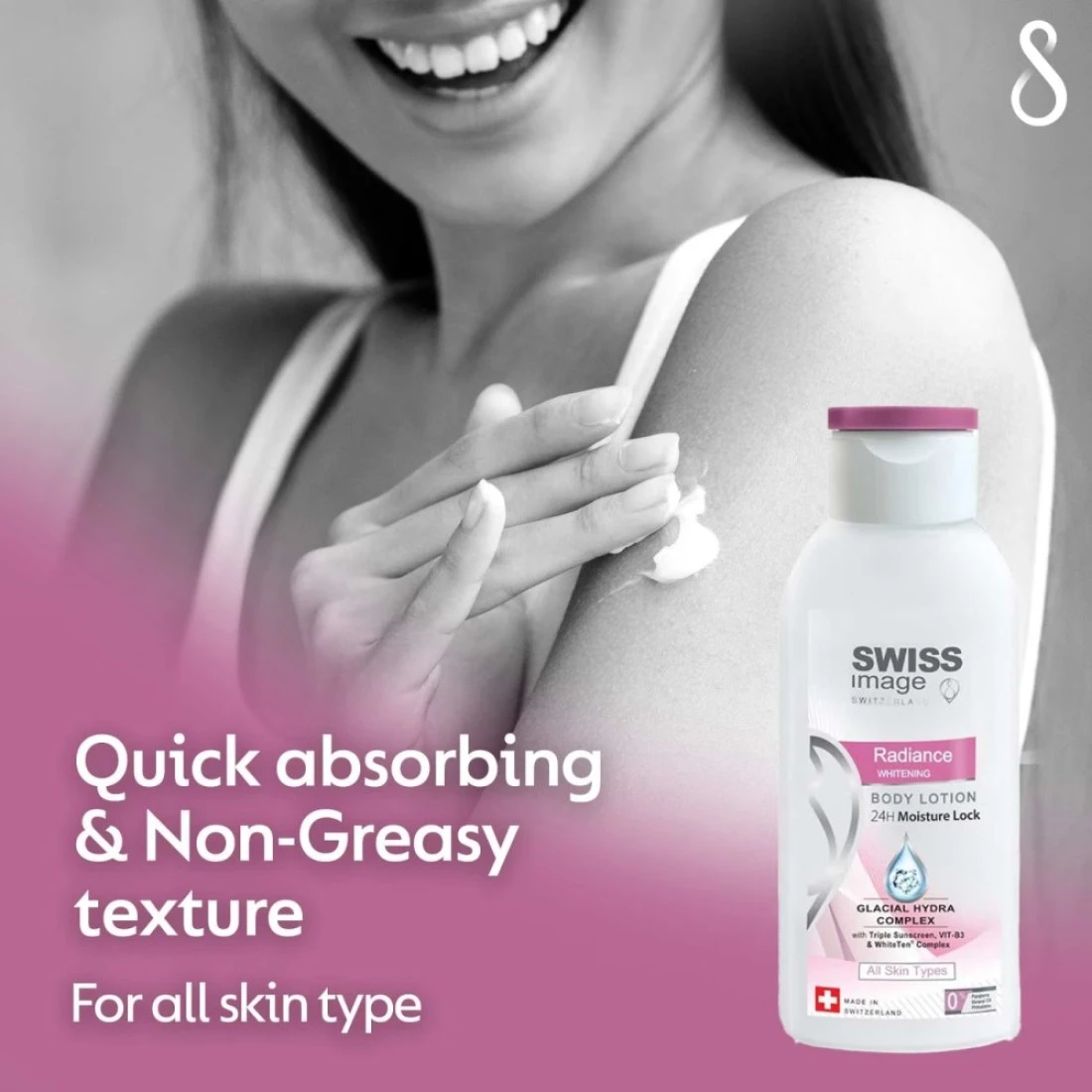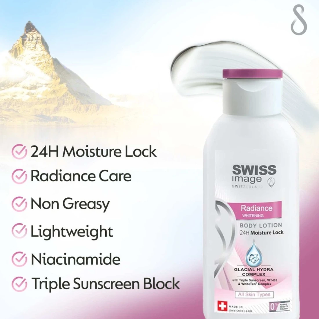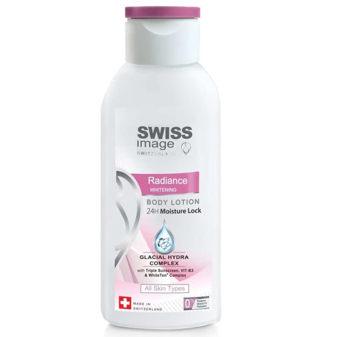 Swiss Image Radiance Whitening Body Lotion Clear 250ml is a luxurious body lotion that helps to brighten and even out the skin tone. It is enriched with natural ingredients like Swiss garden cress sprout extract and vitamin B3 which work together to reduce the appearance of dark spots and promote a more radiant complexion. The lightweight formula absorbs quickly into the skin leaving it feeling soft smooth and hydrated. This body lotion is perfect for those looking to achieve brighter and more youthful-looking skin.