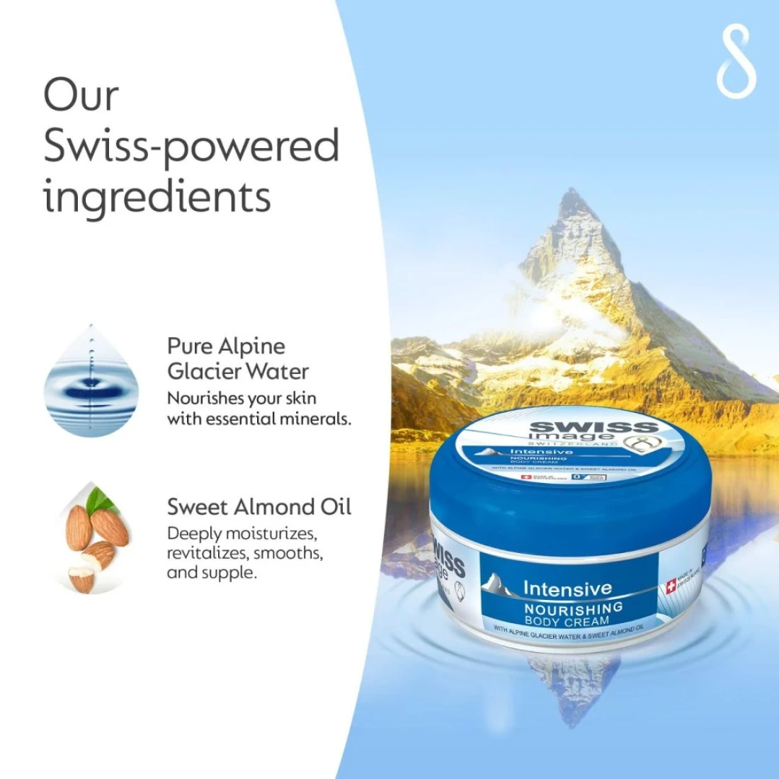 The Swiss Image Intensive Nourishing Body Cream is a luxurious and deeply moisturizing cream that is perfect for dry skin. It is enriched with natural ingredients like shea butter and almond oil, which help to nourish and hydrate the skin, leaving it soft, smooth, and supple. This body cream has a rich and creamy texture that absorbs quickly into the skin without leaving a greasy residue. It provides long-lasting hydration and helps to repair and protect the skin's moisture barrier. It also has a pleasant and refreshing scent that lingers on the skin throughout the day. With regular use, the Swiss Image Intensive Nourishing Body Cream helps to improve the overall texture and appearance of the skin. It is suitable for all skin types and can be used daily for best results. Pamper your skin with this indulgent body cream and enjoy the benefits of intense nourishment and hydration.