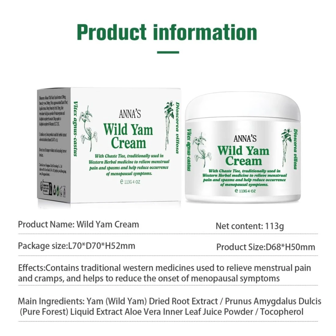 ANNA'S Wild Yam Cream Relieves Symptoms of Menopause: Hot Flashes, Night Sweats, Stress, Irritability, Joint Pain, Insomnia, Headaches, Mood Swings, Low Energy, Weight Gain and MoreNatural and Organic Formula:Our Wild Yam Cream for Women is made with natural plant extracts and is safe for use on the body. It helps keep the body balanced and can improve overall circulation to benefit your entire system.NATURAL RELIEF: Our Wild Yam Cream is enriched with potent botanicals like Wild Yam Extract and Pueraria Extract. This formula helps balance hormones without side effects and relieves common menopausal symptoms like hot flashes and night sweats.NO ESTROGEN OR PROGESTERONE: Wild yam root has anti-inflammatory properties, making it a powerful ally for women going through menopause. Our PMS Mood Swing Relief Cream contains no estrogen or progesterone, ensuring a completely natural approach.Widely Used] Apply 1-2 times a day, 1/8 to 1/2 teaspoon of cream each time, and can be applied to any part of the body. Learn the uses of Wild Yam Cream and incorporate it into your skincare routine to give your skin a natural, healthy glow.