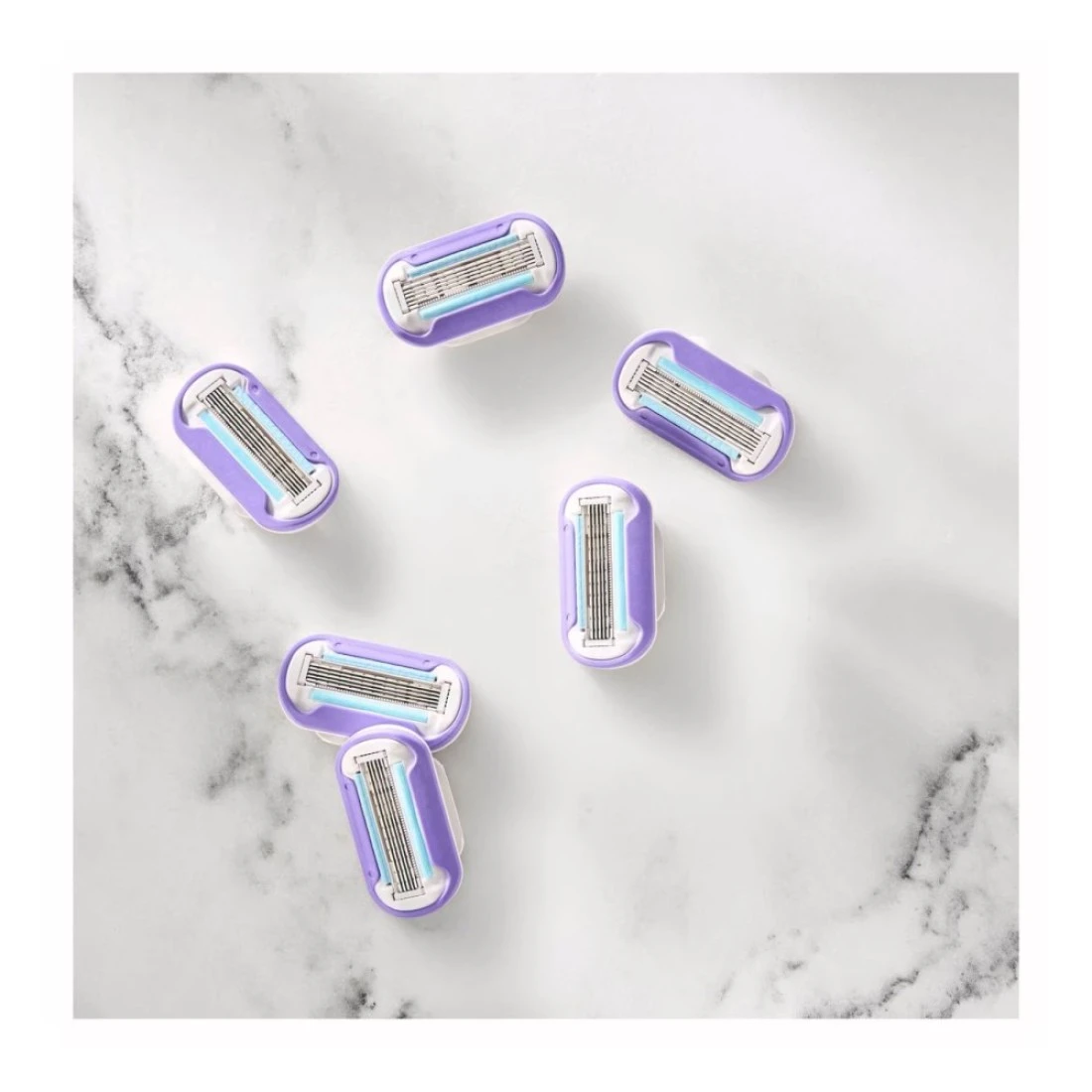 The Gillette Venus Swirl Razor Blade Refills in Purple come in a pack of 4. These razor blade refills are designed to fit the Gillette Venus Swirl Razor providing a smooth and comfortable shave. The purple color adds a touch of style to your shaving routine. These refills feature a unique Flexi Ball technology that allows the blades to contour to tricky areas providing a close and precise shave. With their 5-blade design and water-activated moisture ribbon, these refills ensure a smooth and moisturized shave every time. Upgrade your shaving experience with the Gillette Venus Swirl Razor Blade Refills in Purple.