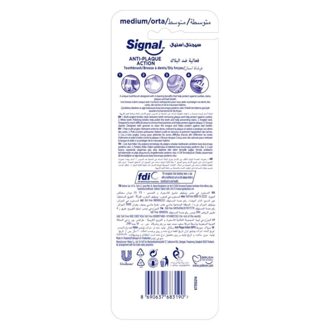 The Signal Anti-Plaque Action Toothbrush Medium Multicolour 4 PCS is a set of four toothbrushes designed to effectively remove plaque from teeth. The medium bristles provide a balanced level of firmness making it suitable for most individuals. The multicolour design adds a fun and vibrant touch to your oral care routine. With its anti-plaque action, this toothbrush helps to maintain a clean and healthy mouth.