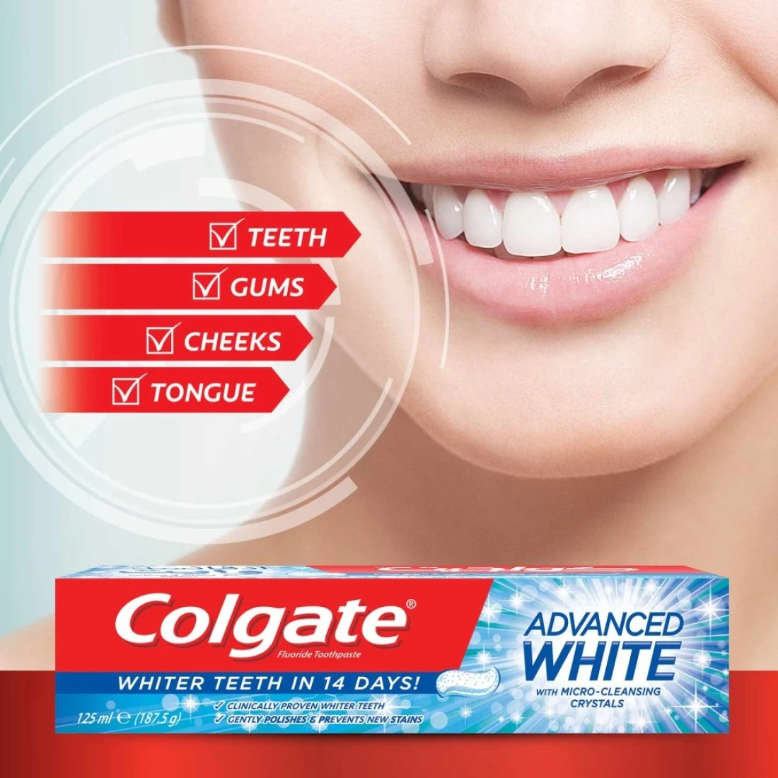 Colgate Advanced White Toothpaste is a highly effective toothpaste that provides advanced whitening for your teeth. With its unique formula, it removes stains and prevents new ones from forming, giving you a brighter and whiter smile. This pack of 2 100ml tubes ensures that you have enough toothpaste to last you for a long time. Using Colgate Advanced White Toothpaste regularly can help you achieve a visibly whiter smile in just two weeks. Its enamel-safe formula gently polishes your teeth, removing surface stains and revealing the natural whiteness of your teeth. With regular use, you can maintain a beautiful and radiant smile. Colgate Advanced White Toothpaste also provides long-lasting freshness, leaving your breath feeling clean and minty fresh. Its refreshing flavour ensures that you have a pleasant brushing experience every time. With this pack of 2 100ml tubes, you can enjoy the benefits of Colgate Advanced White Toothpaste for an extended period.