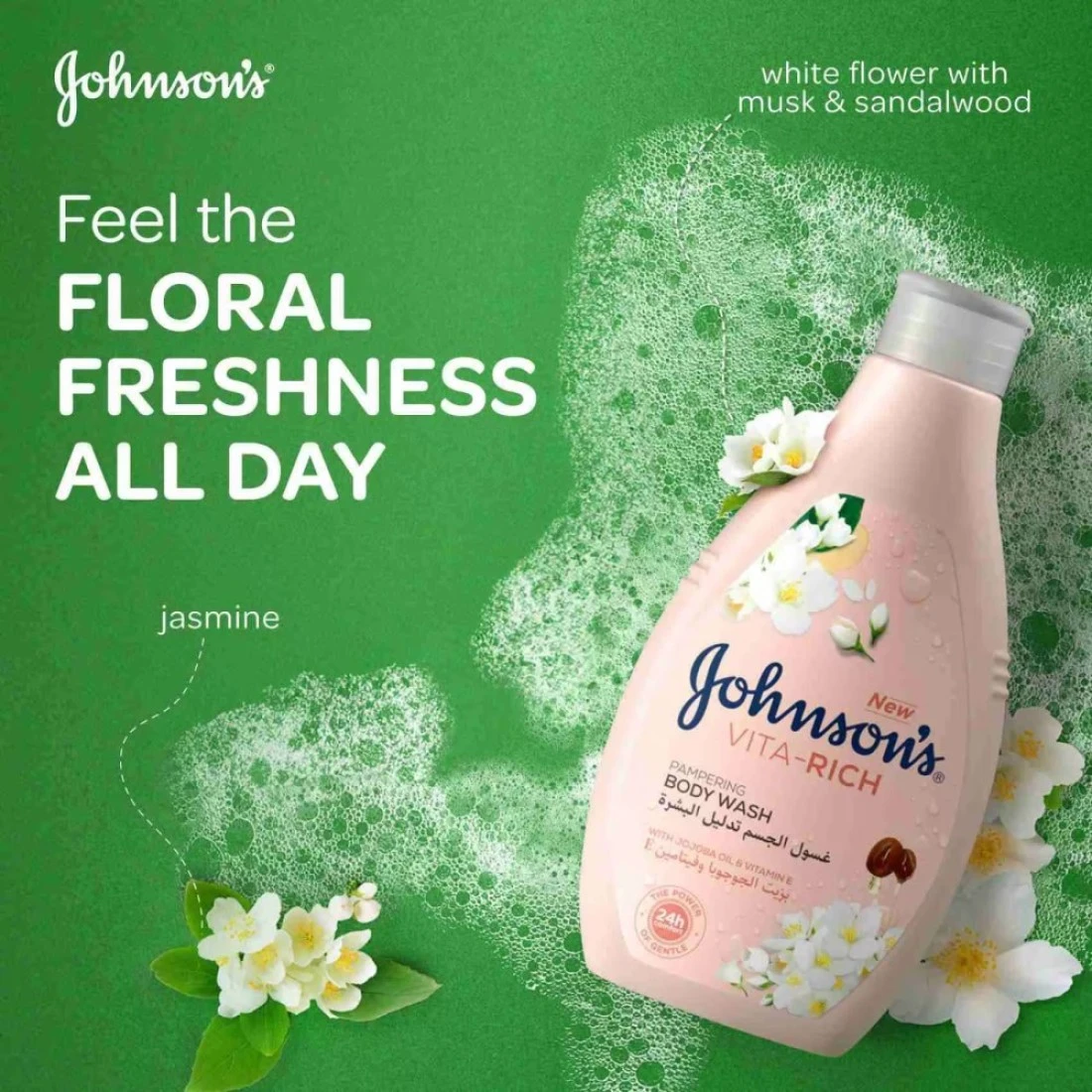 JASMINE AND WHITE FLOWERS: Johnson's Vita Rich Pampering Body Wash is infused with the scent of jasmine and white flowers, mixed with precious musk and sandalwood, so you can pamper your skin with this elegant and unique scent.LUSCIOUS FRAGRANCE: Indulge your senses with the luscious fragrance of Johnson's Vita Rich Pampering Body Wash. Let the captivating scent uplift your shower experience and leave a subtle, lingering aroma on your skin.ACTIVELY HYDRATING FORMULA: The lather-rich formula of Johnson's Vita Rich Body Wash actively hydrates your skin. Enjoy the nourishing benefits as it leaves your skin beautifully scented, and soft.FEEL THE FLORAL FRESHNESS: Treat your skin to floral freshness with Johnson's Vita Rich Pampering Body Wash. Its thick, foamy texture ensures deep hydration, cleansing the skin and getting rid of impurities.VITAMIN E AND JOJOBA OIL ENRICHED: Enriched with Jojoba oil and vitamin E, Johnson's Vita Rich Body Wash’s formula cleanses your skin, while leaving it hydrated and soft. Its rich, creamy formula gives you a fresh after-shower clean feeling.