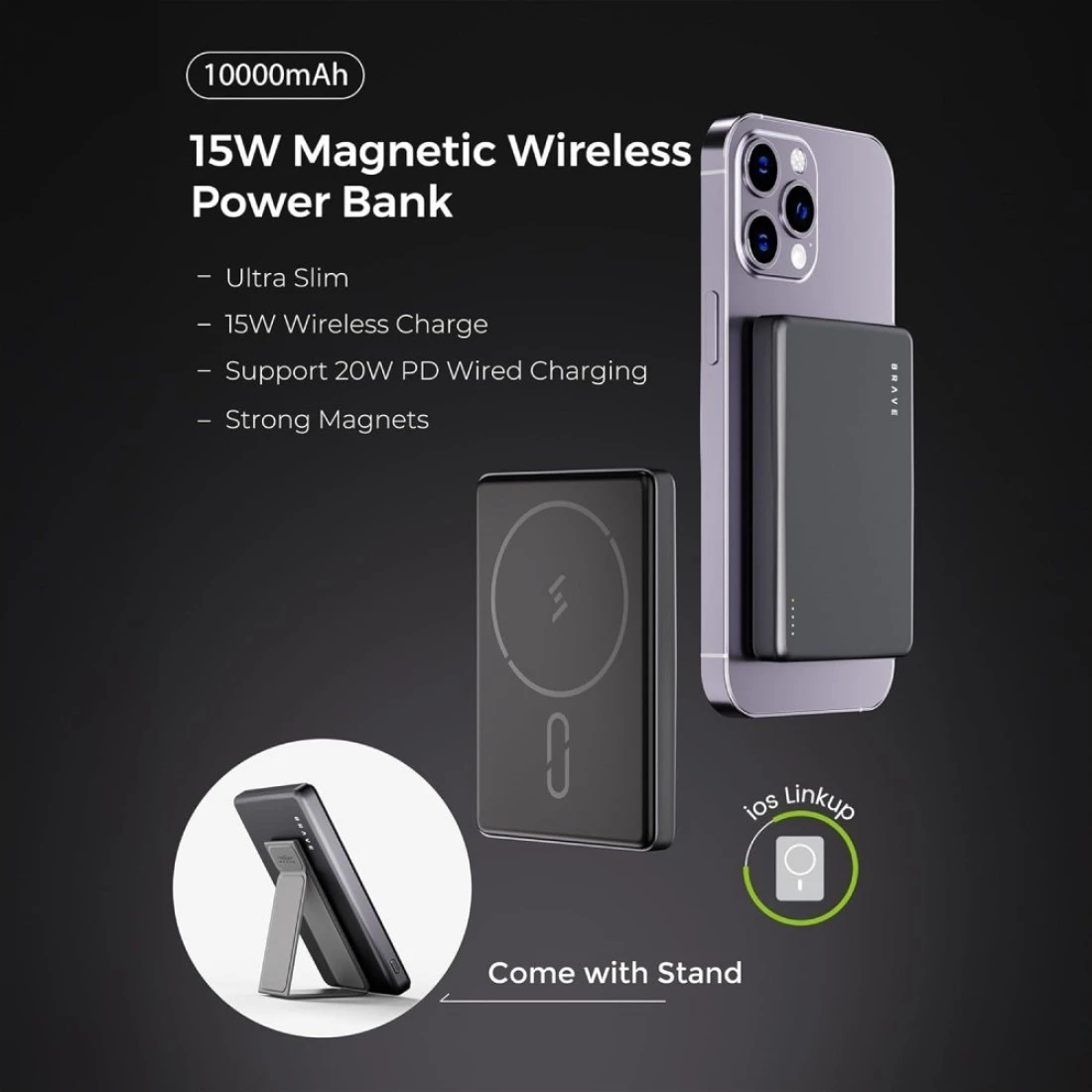 BRAVE 10,000mAh Magnetic Wireless Power Bank with Stand, 15W Wireless Portable Charger with 20W USB C Charging, MagSafe Battery for iPhone 16/16 Pro/16 Pro Max, Samsung S24/S23/S22 - BP-20