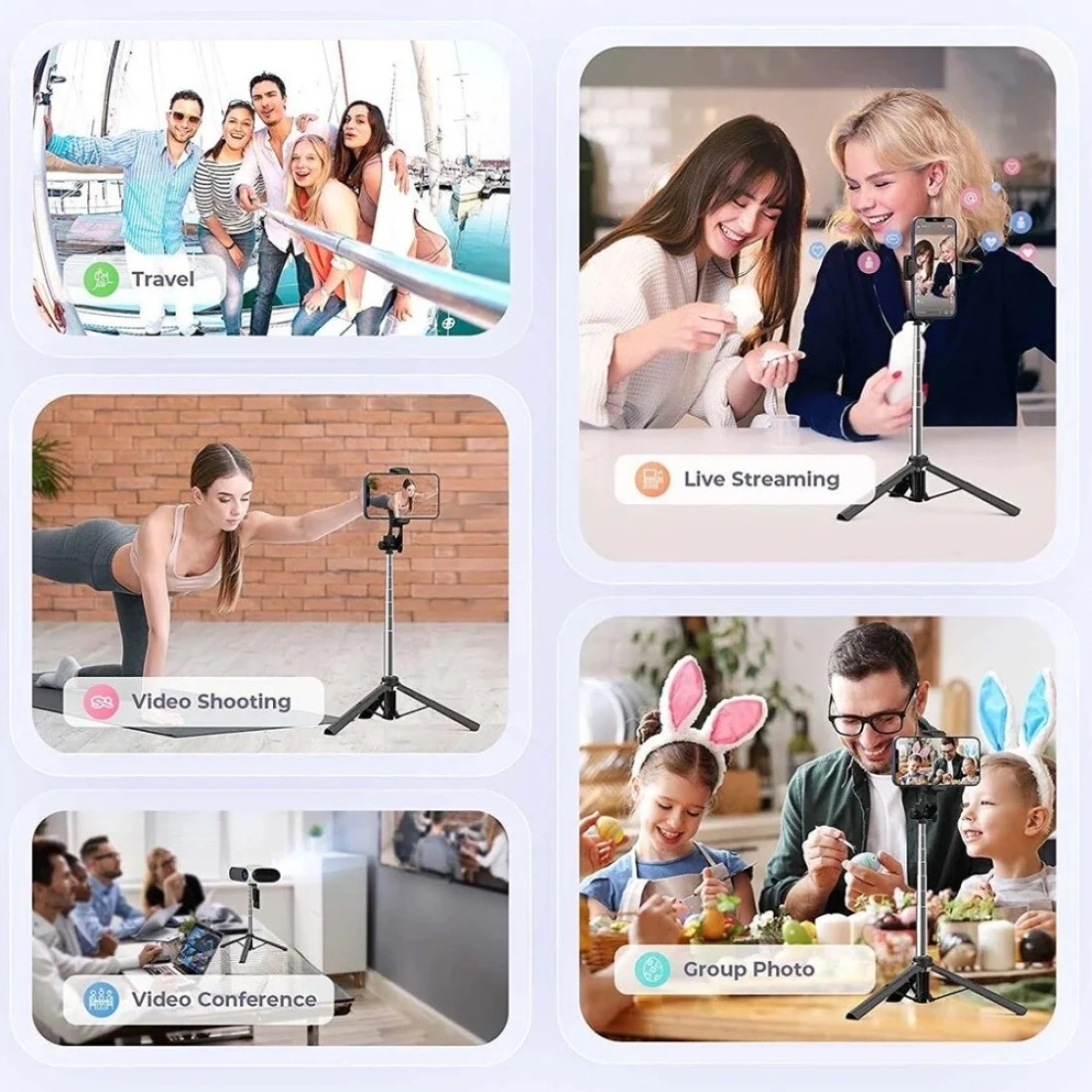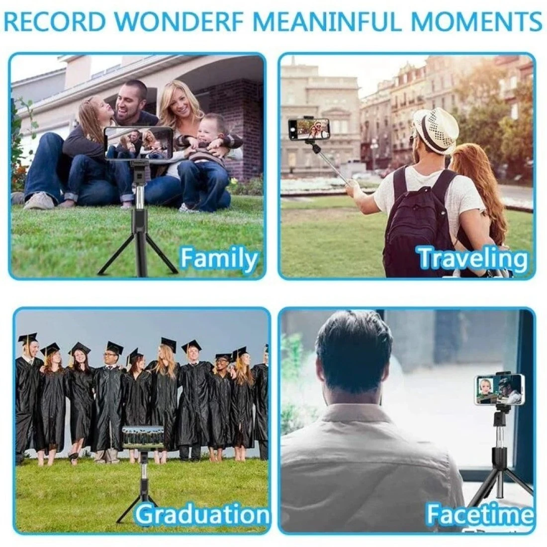 Multifunctional Design: Selfie stick, tripod, and remote control in one compact tool.