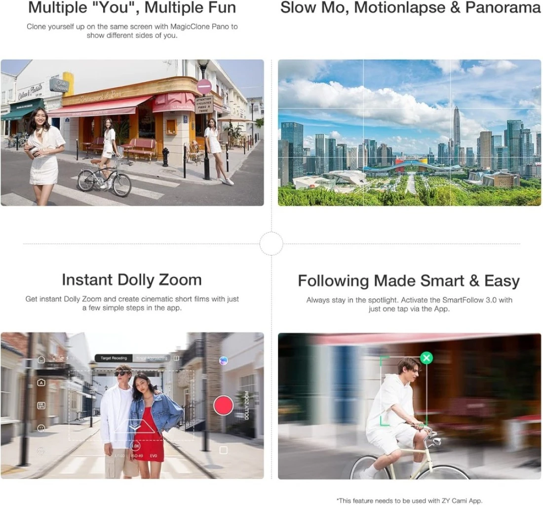 (Smart Follow & Say Yeah to Gesture Control)Activate the SmartFollow 3.0 with just one tap via ZY Cami APP, and always stay in the spotlight, and you can use just a single gesture to control the shooting while you can just be yourself anywhere anytime. Available in multiple panorama modes.