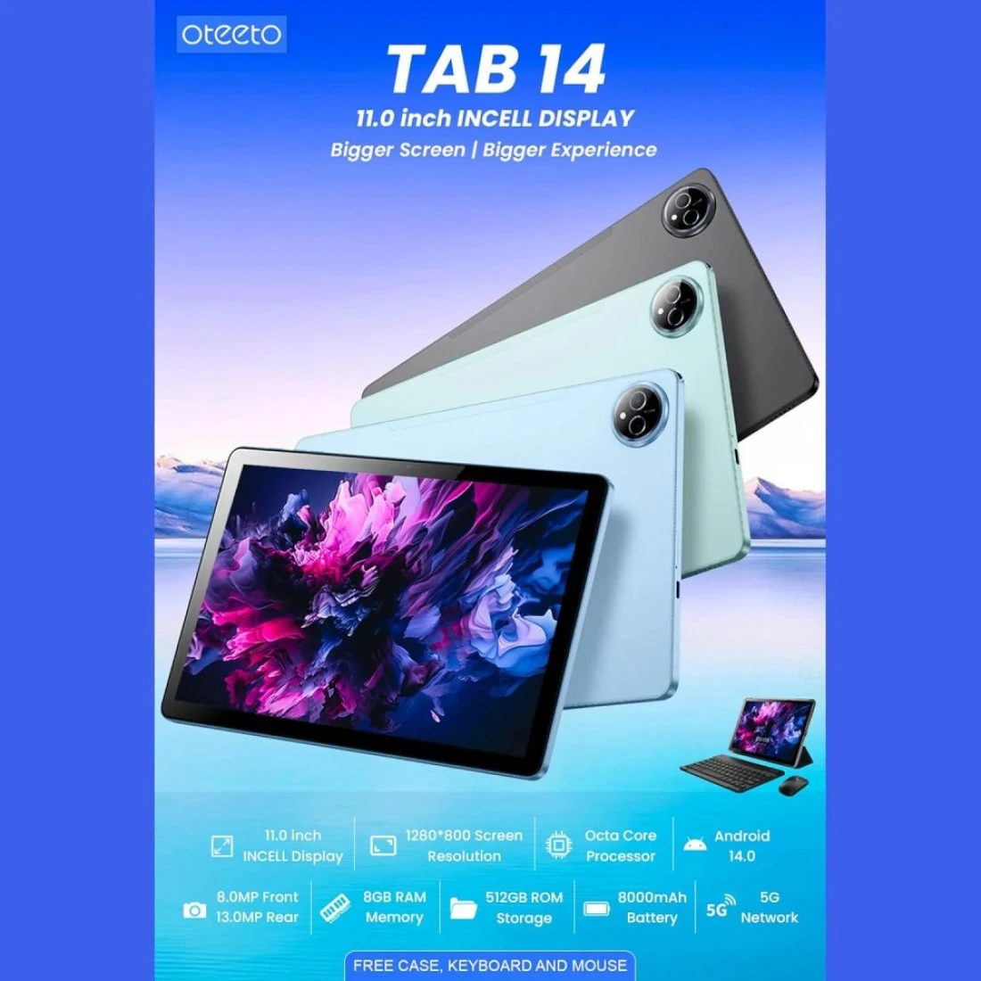 1 Year Seller Warranty OnlyDisplay: 11.0" IPS LCD 1280x800 PixelOperating System: Android 14CPU: Octa Core 2.0GHzMemory: 8GB RAM + 512GB ROMCamera: 8.0MP Front + 13.0MP RearTouch: Tempered Glass Touch PanelBattery: 8000mAhPower Input: 5V/2ASIM Support: 2G/3G/4G/5GExternal Slot: SD Card/Audio JackBox Includes: Tablet PC /Charger/ Type-C Cable/ Screen Protector/ User Manual/ Case/ Touch Pen/ Keyboard/ Mouse