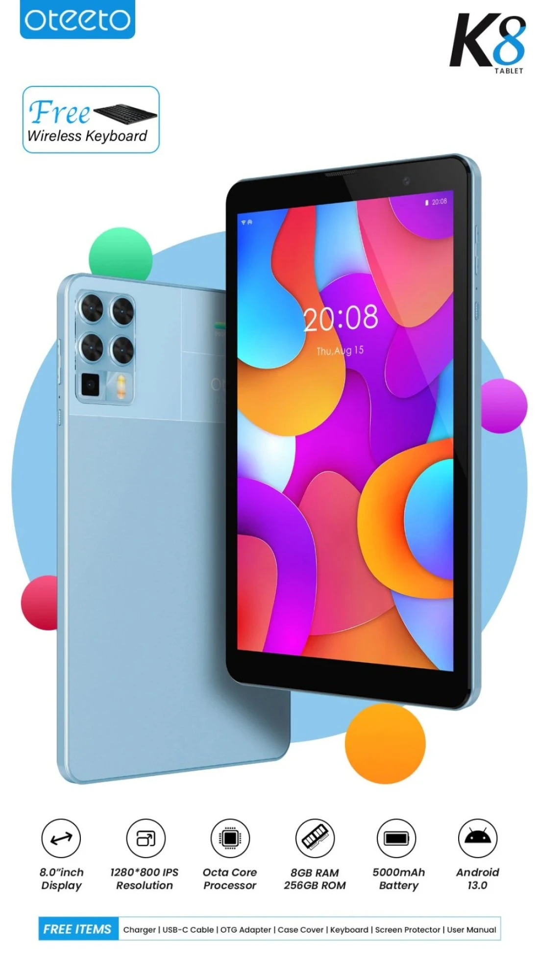 Model No: TAB 8 /K8 Size/Network: 8inch / 3G CPU: 1.3GHz Quad-core LCD: 800*1280 HD TP: G+P RAM + ROM: 8GB + 256GB Battery: 5000mAh Camera: 5.0MP Front + 13.0MP Rear IOS: Android 13.0 Color: , Blue, SD Card: Support up-to 128GB SIM: Dual Sim Accessories: Tablet PC, Charger, Type C Cable, Screen protector, Cover, User manual, Tablet stand, Keyboard
