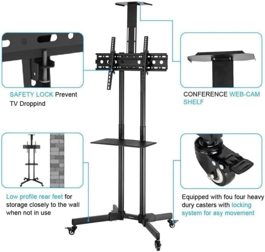 Homey Tech IBX-1500 Mobile/Rolling TV Cart – Tilt +15° to -15°, Lockable Wheels, Fits 32-65 Inch TVs (Max 50kg, VESA 600x400mm), Includes Camera Rack