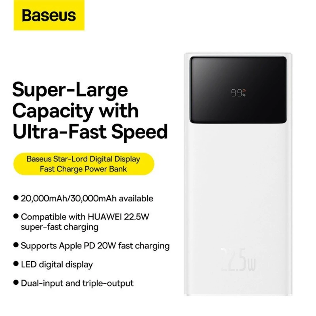 Baseus 30000.0 mAh Portable Charger Power Bank 30000mAh, 22.5W QC 3.0 PD 20W USB 3-Port 3A Fast Charging Charger C Battery Pack, Smart LED Display Phone for iPhone Series, Samsung, Android etc, White
