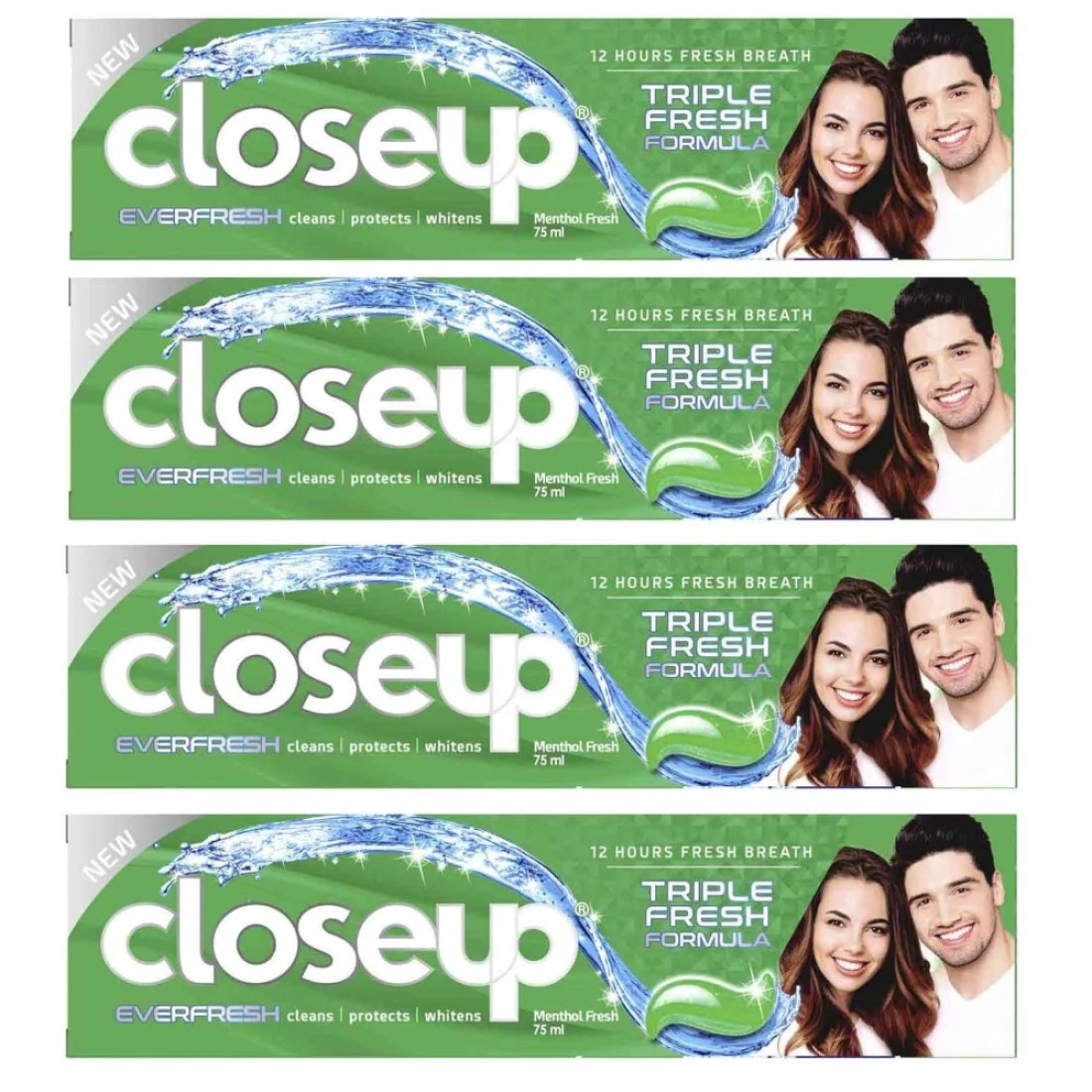 Closeup Antibacterial Toothpaste Menthol Fresh is a pack of 4 75ml tubes of toothpaste. It is specially formulated with antibacterial properties to help fight germs and bacteria that can cause bad breath and tooth decay. The refreshing menthol flavour leaves your mouth feeling clean and fresh. This toothpaste is perfect for daily use to maintain oral hygiene and keep your breath smelling minty fresh.