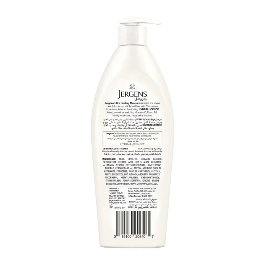 Jergens Ultra Healing Moisturizer is a 400ml lotion that is specially formulated to deeply nourish and heal dry rough skin. It contains a unique blend of vitamins C E and B5 as well as hydrating ingredients like glycerine and petroleum. This moisturizer absorbs quickly into the skin leaving it feeling soft smooth and intensely moisturized. With regular use, it helps to improve the skin's elasticity and restore its natural moisture barrier. Perfect for daily use Jergens Ultra Healing Moisturizer provides long-lasting hydration and helps to relieve dryness leaving your skin looking and feeling healthier.