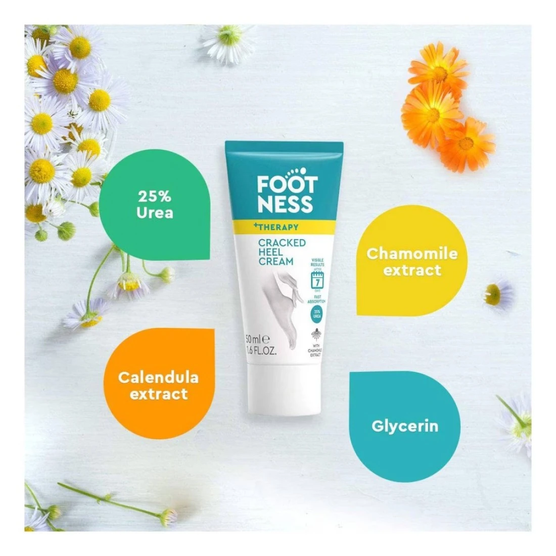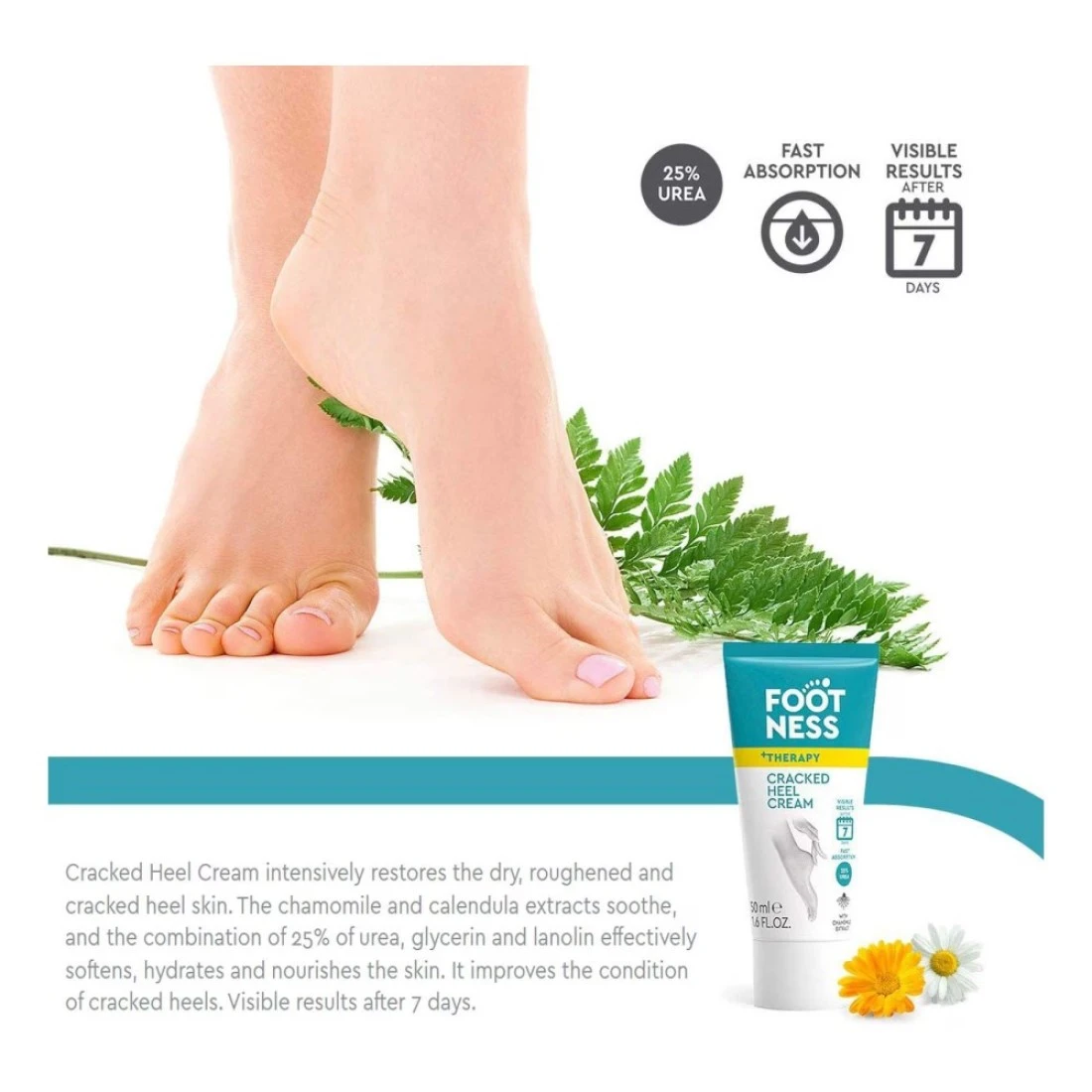 - The chamomile and calendula extracts soothe and the combination of 25% of urea glycerine and lanolin effectively softens hydrates and nourishes the skin