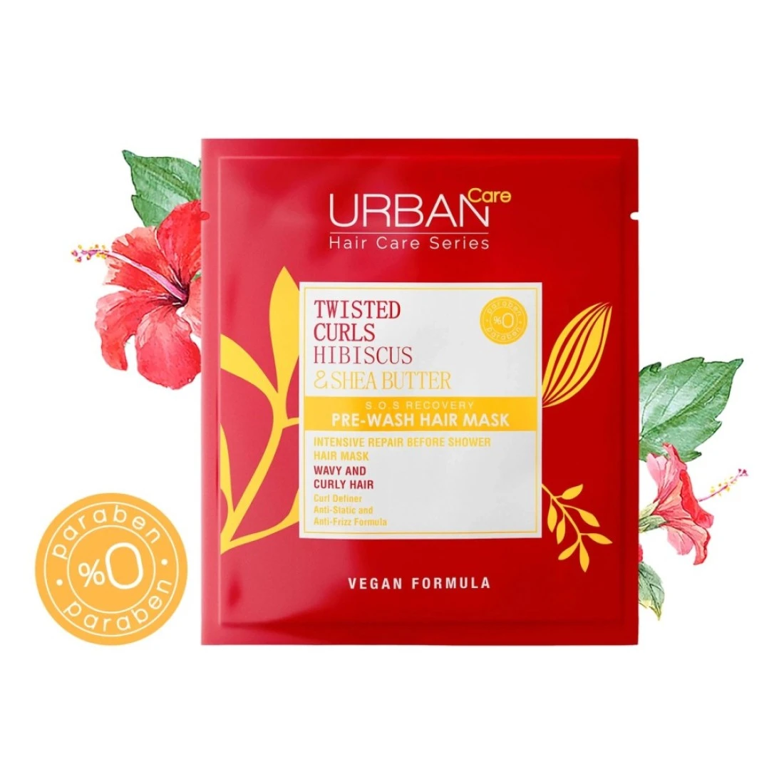 Urban Care Twisted Curls Hibiscus and Shea Butter Pre-Wash Hair Mask is a 50ml hair treatment designed to nourish and hydrate curly hair before shampooing. The formula contains hibiscus and shea butter to help define curls and improve overall hair health.