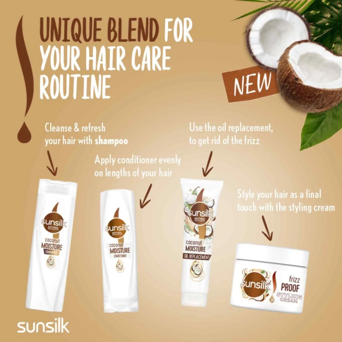 - Enjoy the divine pleasure of Sunsilk Coconut Moisture Shampoo blended with the nourishing and moisturising Coconut Oil.