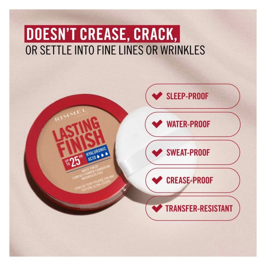 Rimmel Lasting Finish Compact Powder foundation blends, blurs and boosts with a real skin soft-focus finish. The full-coverage, hybrid formula of this vegan foundation has a matte finish for up to 25HR long-lasting wear and all-day oil control. Blends, blurs and boosts with a real skin soft-focus finish for up to 25HR wear and all-day oil control. The anti-pollution shield & UV booster help to protect the skin as it perfects while Hyaluronic Acid ensures it feels non-drying.