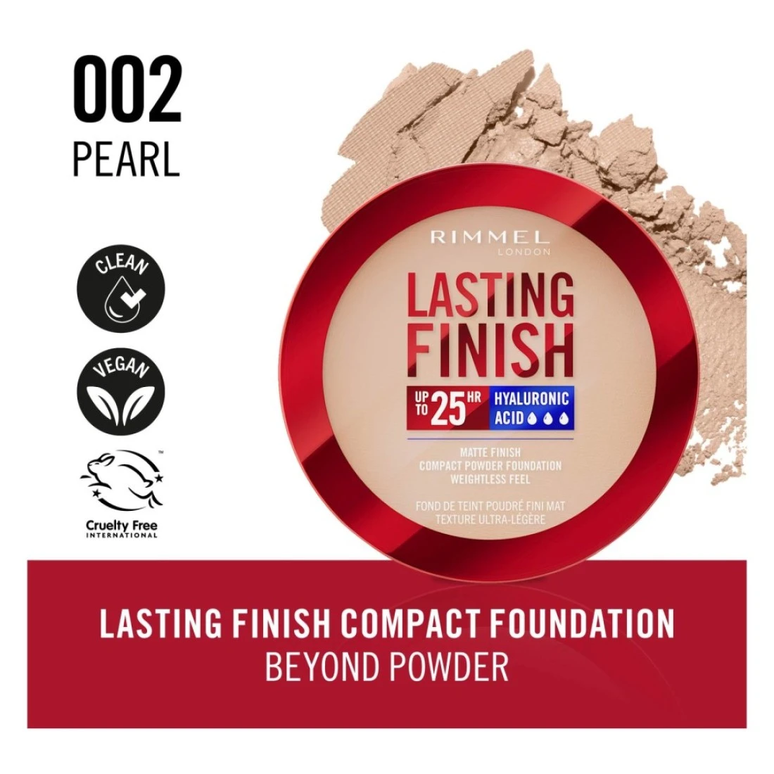 Rimmel London Lasting Finish 25H Hyaluronic Acid Matte Finish Compact Powder Foundation, 002 Pearl, 7g