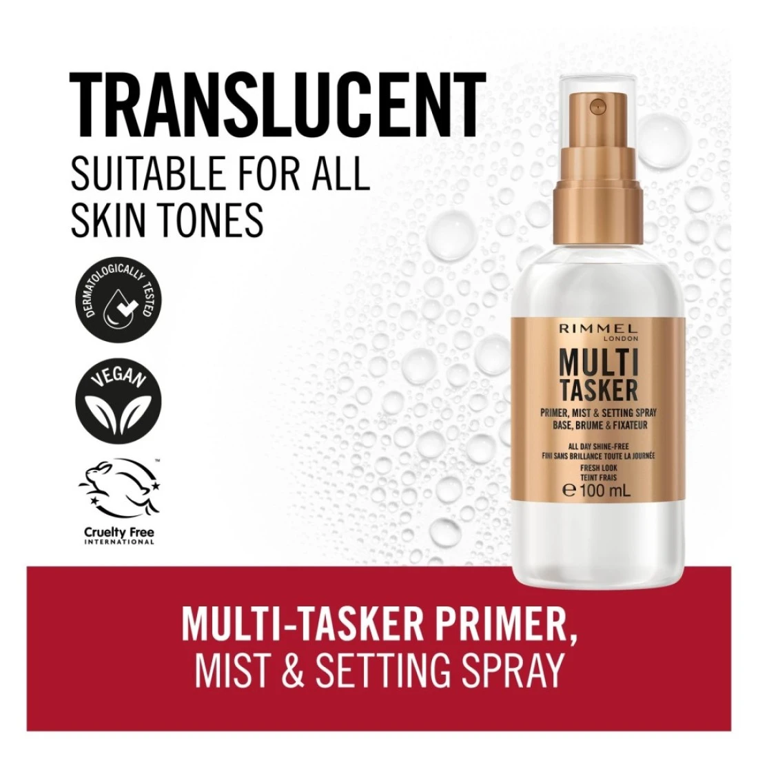 Rimmel 3-in-1 Multi-Tasker Primer, Mist & Setting Spray primes your complexion and has all-day setting power. This vegan face primer & setting spray improves the look of dull & dry skin and leaves skin feeling instantly revitalised. It also can be used to refresh your base and keep everything in place, perfect for when you need a cool-down or to give your makeup a little boost.