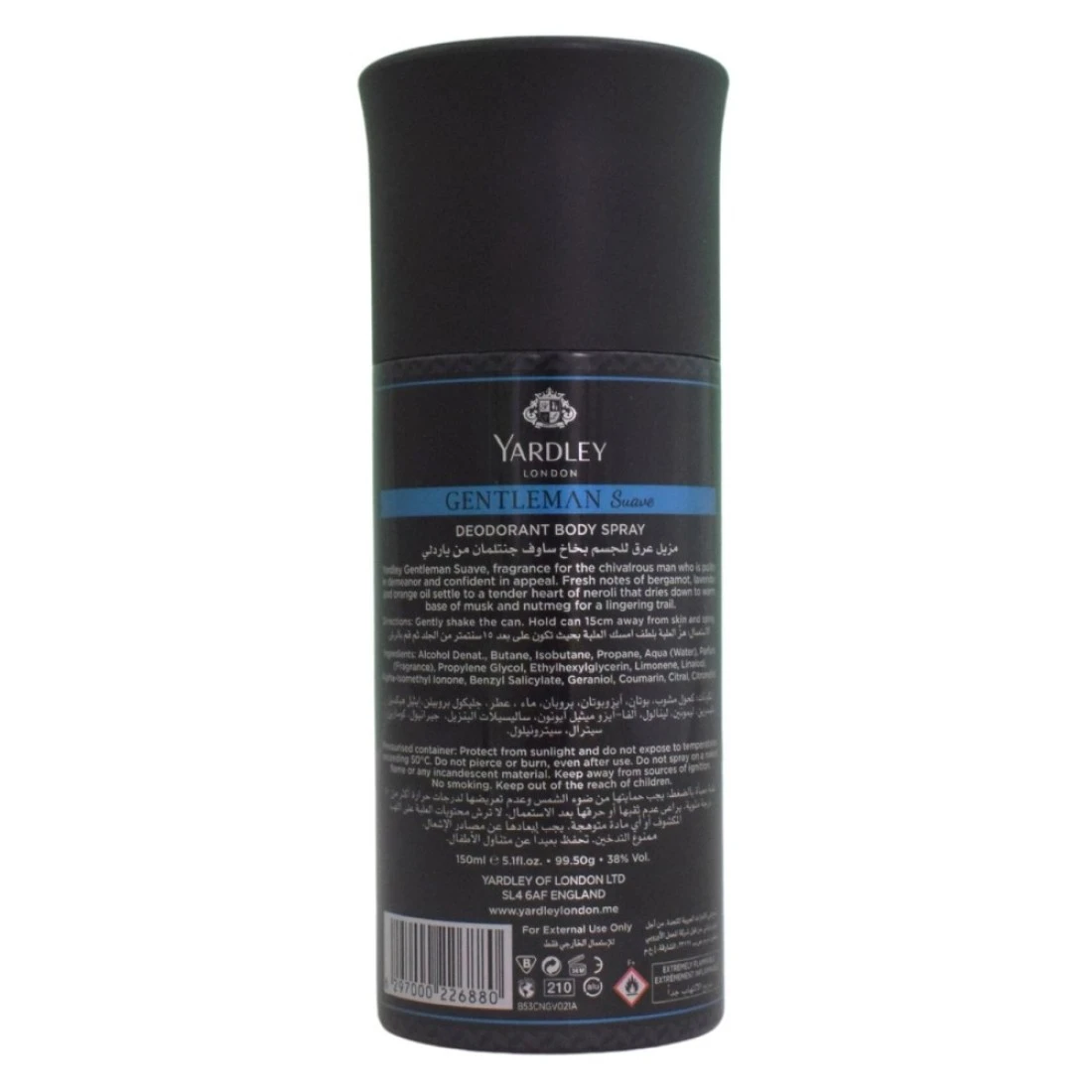 Yardley London Gentleman Suave Body Spray is a sophisticated and refined fragrance for men. This body spray combines notes of bergamot lavender and sandalwood to create a fresh and woody scent. The 150ml bottle is perfect for on-the-go use and leaves a long-lasting fragrance that will keep you smelling great all day.