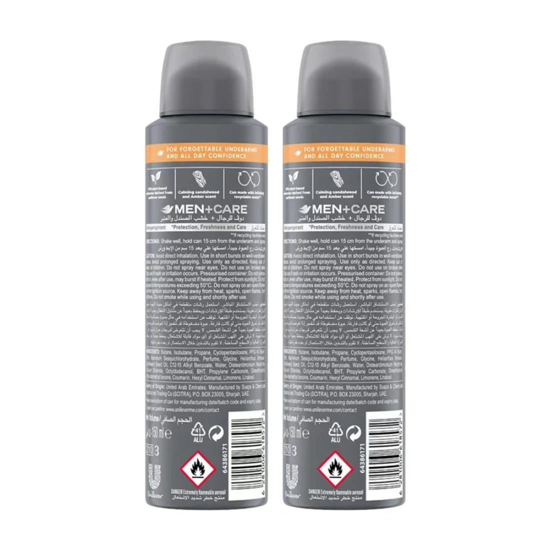 Looking for an uncompromising deodorant for men? Look no more! Get powerful protection against sweat and odor with Dove Men+Care Antiperspirant Deodorant Body Spray. With Dove’s Triple Defense Technology for odor, sweat and care, the NEW Dove Men+Care, a range specially engineered for men, gives you better and complete protection, so smelling bad or feeling uncomfortable isn’t an added worry to your busy and stressful days. Be confident, wherever you go! Our powerful antiperspirant formula with 72-hour protection for long lasting freshness and care not only helps you get rid of the body odor but also helps control sweat, so your armpits don’t feel wet, and you can be cool, calm and in control, no matter where life takes you. Infused with ¼ moisturizing cream, derived from plant-based ingredients, this aerosol deodorant perfume for men provides additional care and all-day protection without irritation. The formula helps you hydrate irritated skin while providing superior odor and sweat protection. Plus, the subtle and calming scents of Sandalwood and Amber deliver long-lasting freshness, keeping you confident all day long. Get lasting sweat and odor defense + moisturized skin. Experience healthier feeling skin powered by nature. To start smelling and feeling great, simply spray the deo under each of your underarms for 2 to 3 seconds, ensuring you cover the entire underarm area. Dove believes in caring for the planet, which is why, our deodorant spray cans are made with infinitely recyclable aluminium. In addition, globally, we do not test on animals and are certified cruelty-free by PETA. Trust the #1 dermatologist recommended men’s brand. Let Dove Men+Care tackle sweaty and smelly underarms while you focus on achieving your goals! Explore our entire range to discover your favorite fragrance.
