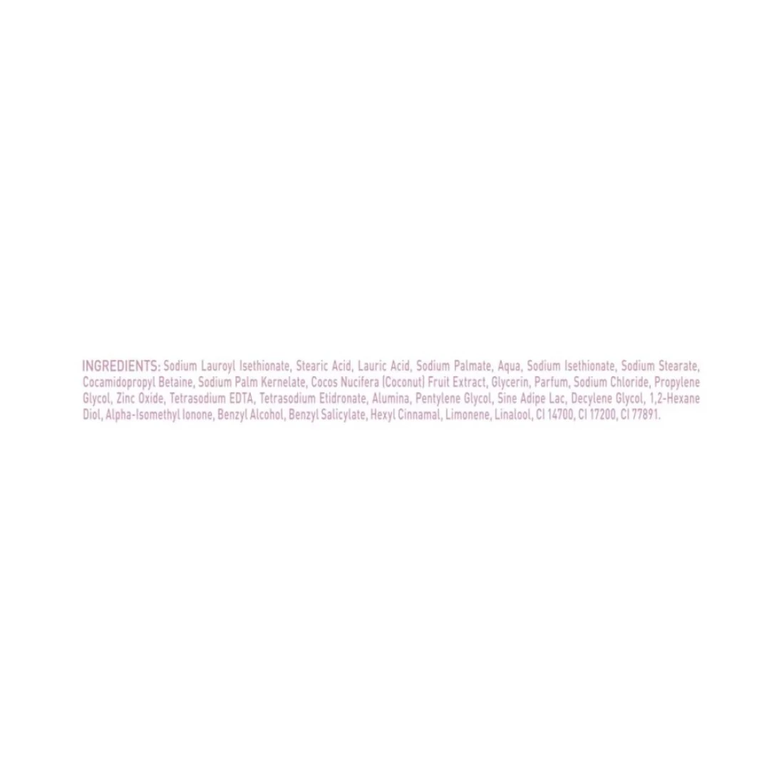 ingredients : Sodium Lauroyl Isethionate, Stearic Acid, Lauric Acid, Sodium Tallowate or Sodium Palmitate, Water (Aqua), Sodium Isethionate, Sodium Stearate, Cocamidopropyl Betaine, Sodium Cocoate or Sodium Palm Kernelate, Fragrance (Parfum), Sodium Chloride, Propylene Glycol, Tetrasodium Etidronate, Tetrasodium EDTA, Cocos Nucifera (Coconut) Fruit Extract, Nonfat Dry Milk, Red 4 (CI 14700), Red 33 (CI 17200), Titanium Dioxide