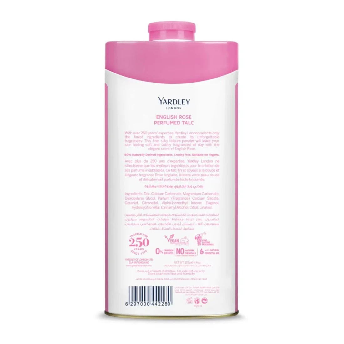 - This Yardley English rose perfumed talc 125g is made with the extracts of freshly plucked roses from the great English countryside