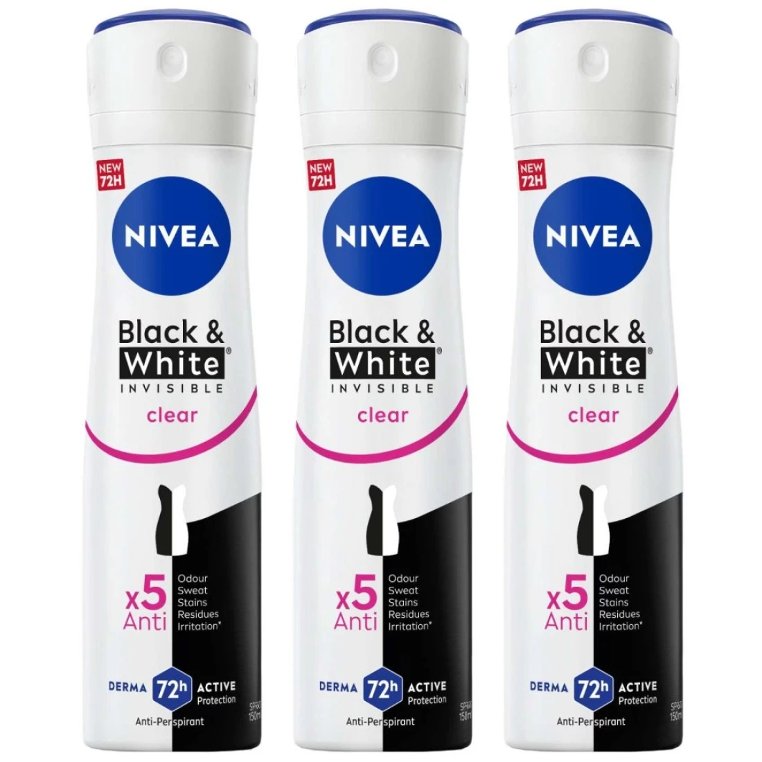NIVEA Black & White Invisible Antiperspirant Deodorant Spray for Women, Clear, 72H Active Protection, 150ml, Pack of 3
