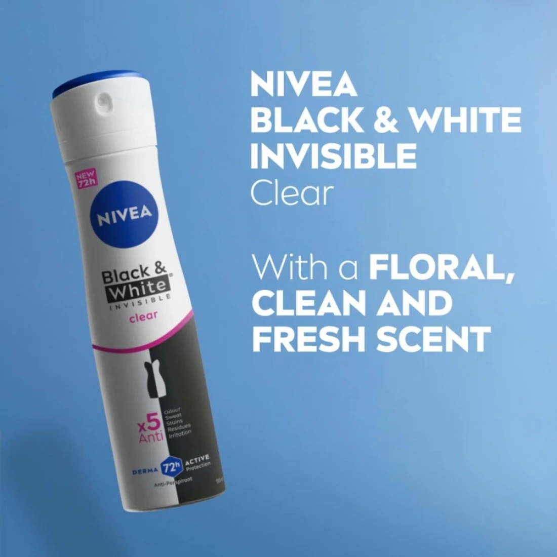 - 5IN1 FORMULA THAT’S GENTLE ON SKIN: Nivea Black & White Invisible Clear Antiperspirant Deodorant Spray delivers 5 benefits in 1—anti-odour, anti-sweat, anti-stains, anti-residues & non-irritating—without causing skin discomfort.