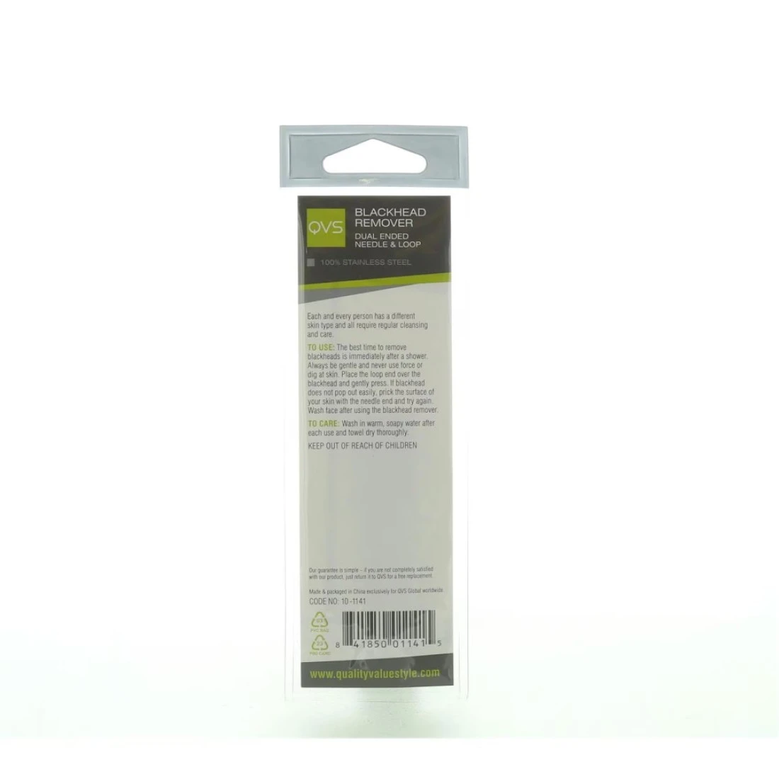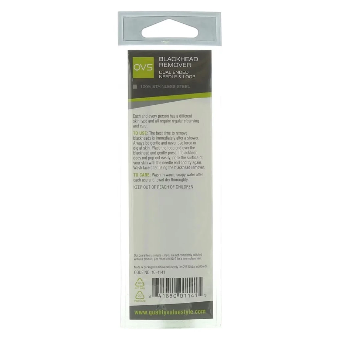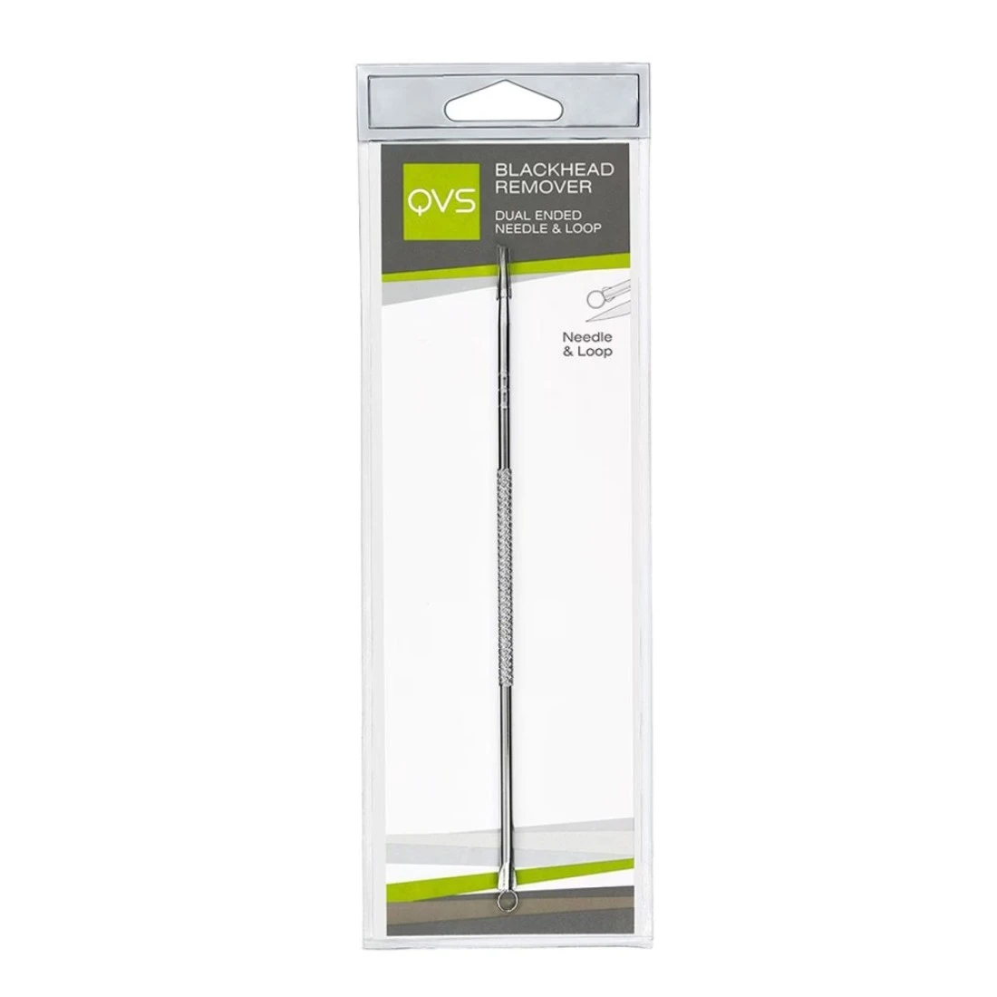 The QVS Blackhead Remover Silver is an effective tool for removing blackheads and whiteheads. Its silver-coated loop gently extracts impurities from the pores leaving the skin clean and smooth. The ergonomic design provides a comfortable grip making it easy to use. Say goodbye to stubborn blackheads with this reliable blackhead remover.